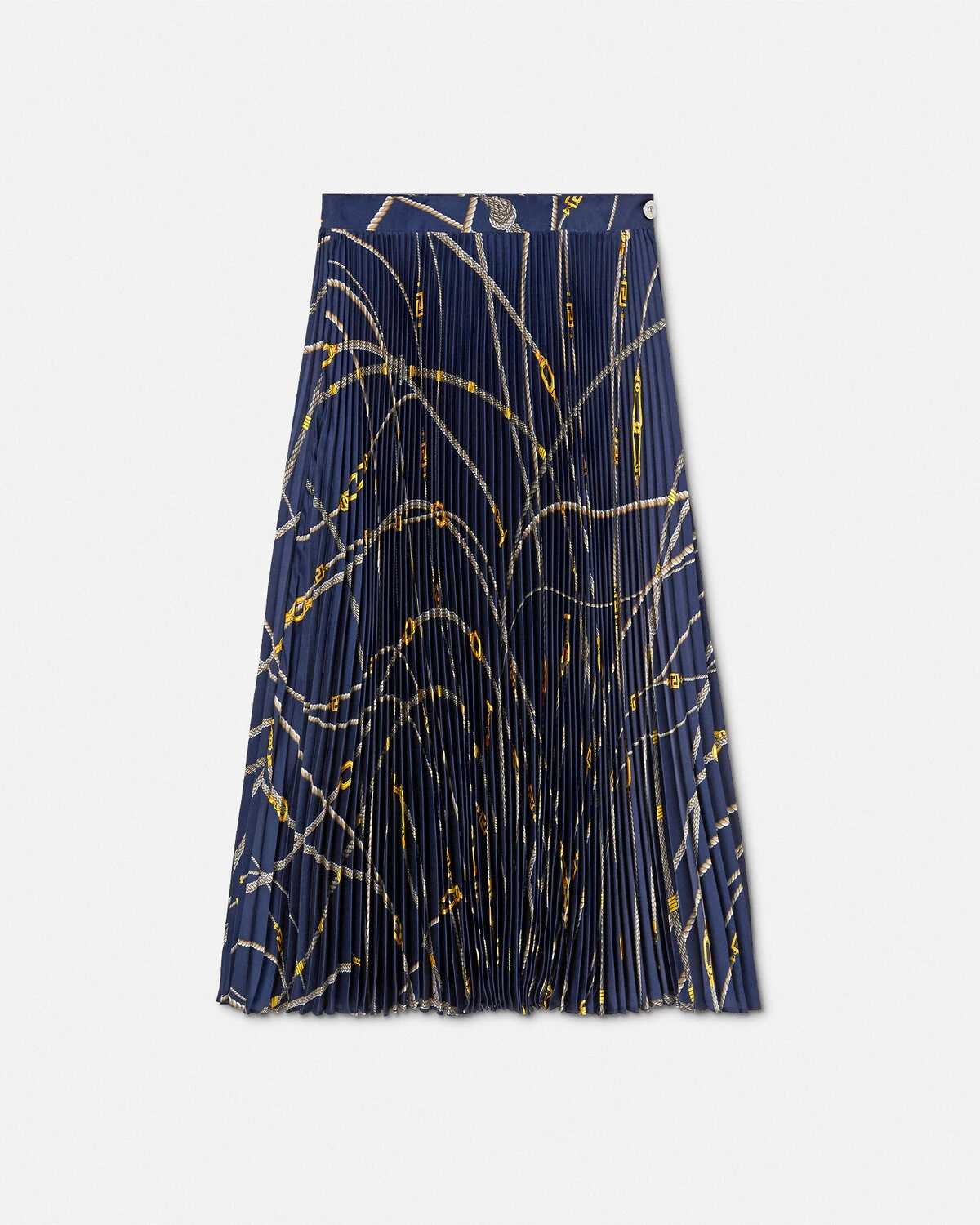 EDITORS'NOTES Versace's midi skirt is printed with nautical ropes and the label's 'Greca' logo. Cut from navy satin-twill, it has a nipped-in waist and fine accordion pleats that create beautiful movement. SIZE & FIT - Fits true to size, however those who are between sizes should take the smaller size - Midi-length, designed to be worn at the waist - Mid-weight, fluid, non-stretchy fabric - Model is 177cm/ 5'10" and is wearing an IT 38 DETAILS & CARE - Multicolored satin-twill - Button and concealed zip fastening at back - 100% polyester - Dry clean