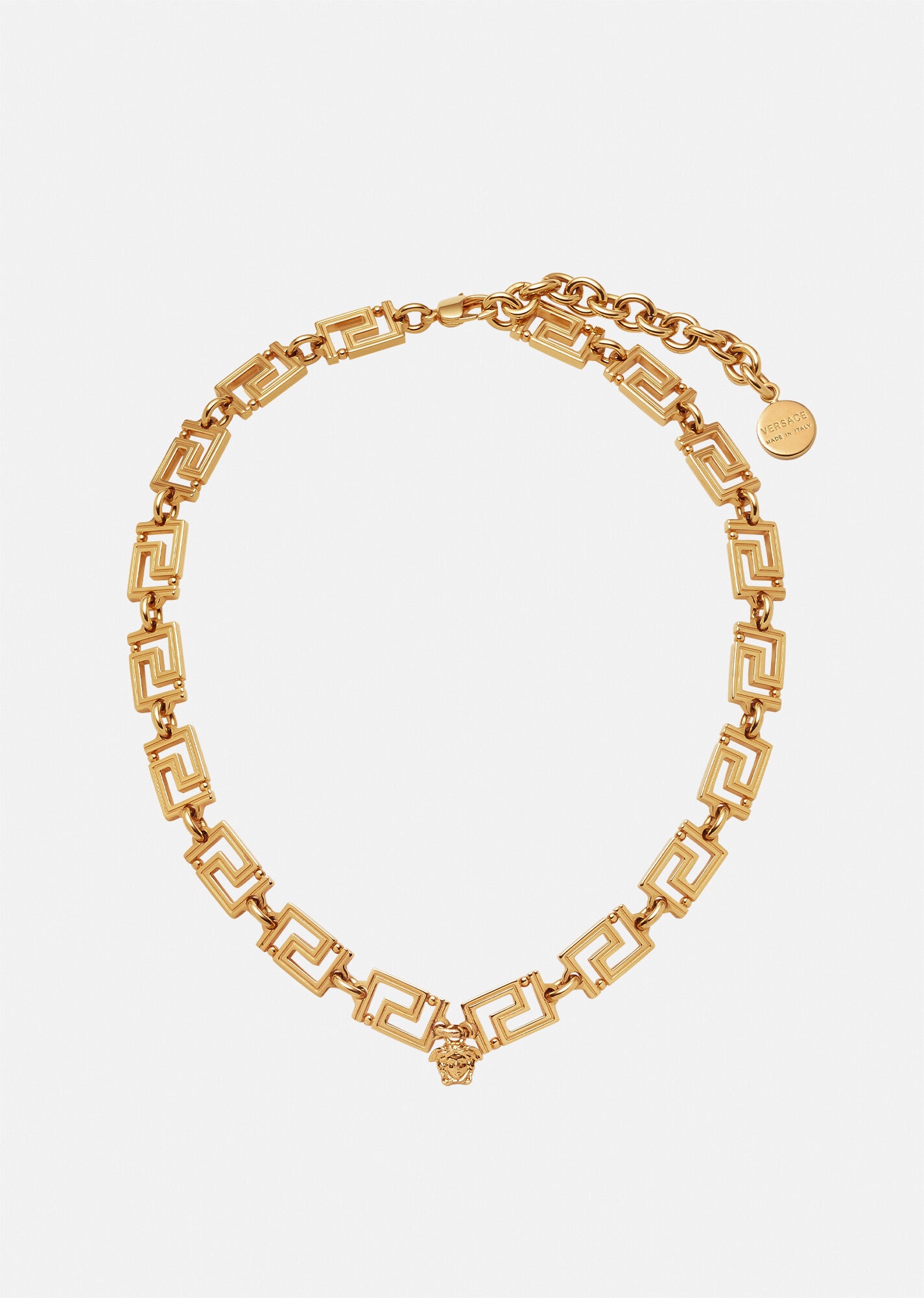 Greca chain necklace enriched with a Medusa charm. Features lobster clasp closure. All Versace Jewelry products are lead and nickel free. All the materials are hypoallergenic. DETAILS & CARE - Greca chain - Medusa charm - Lobster clasp closure - Metal: Brass - Finish: Gold - Please note water and perfume may damage the item - Made in Italy SIZE & FIT - Length: 42 + 7 cm