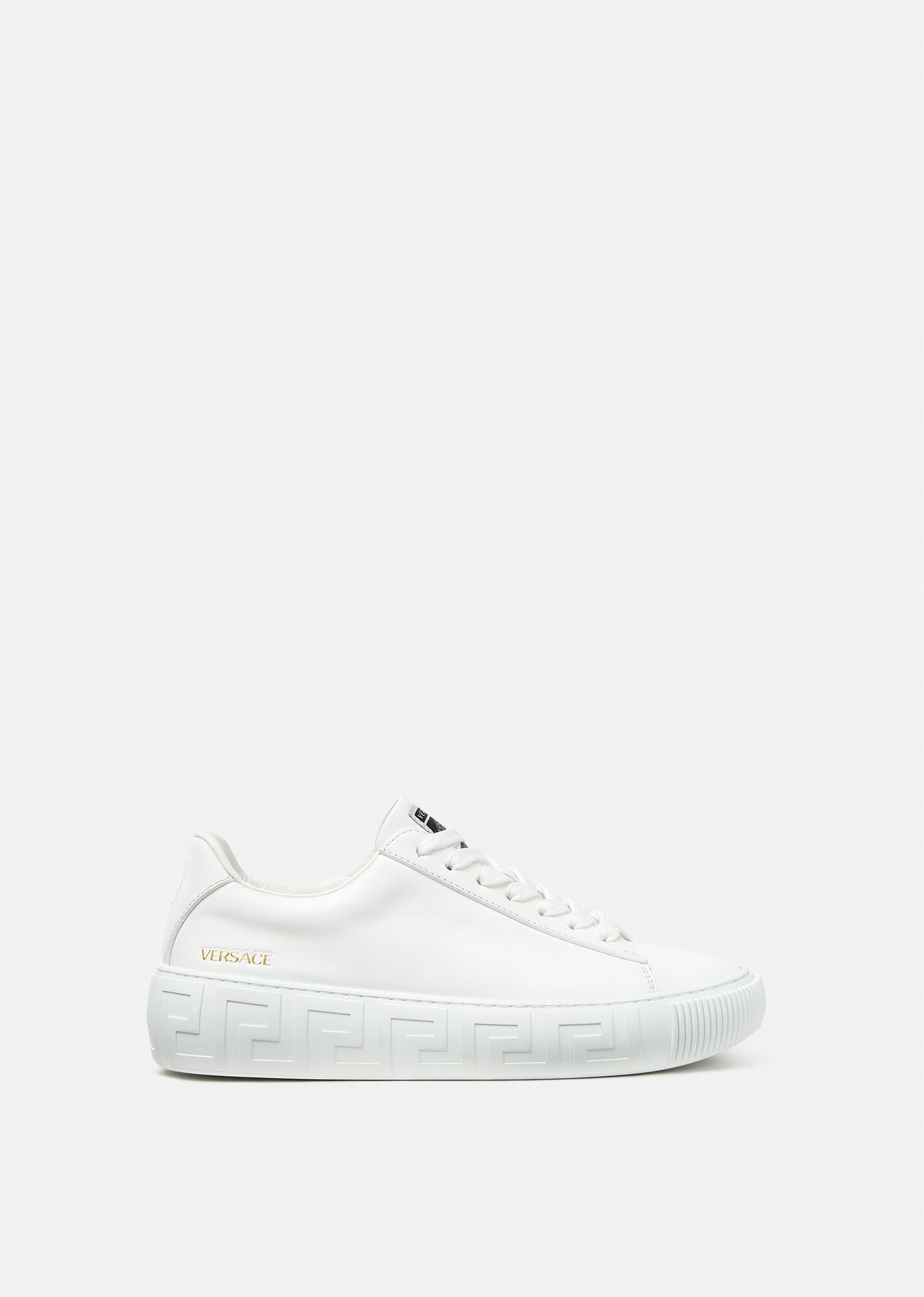 Versace's latest sneaker silhouette, Greca is characterized by understated, clean lines and the graphic Greca pattern on the midsole. A classic low top, lace up design, the sneakers hide a Medusa on the outsole. DETAILS & CARE - Low top - Lace up - Logo patch on tongue - Logo on heel - Greca pattern midsole - Medusa on outsole - Outer fabric: 100% Leather - Insole: 100% Leather - Sole: 100% Rubber - Made in Italy SIZE & FIT - Height: 1,5 - All sizes fit Italian standards - Fits true to size, take your normal size