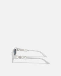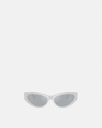 DETAILS A cat-eye shape, these sunglasses have acetate frames and are accented by an open Greca motif with strass embellishments at the temples. - Greca motif - Frame color: Perla gray - Temple color: Perla gray - Lens color: Blue mirror and silver - Frame: Acetate - Temple: Metal Item: O4470B-O54741U56_RTU_TU_ONUL__ SIZE & FIT - Eye size: 2.2" - Bridge: 0.6" - Temple: 5.5"