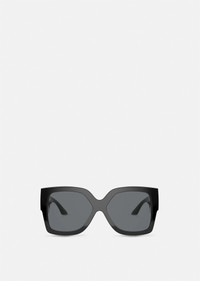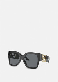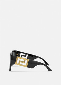 DETAILS Seen on the runway, these rectangular sunglasses are the ultimate glamorous accessory. The new design boasts wide temples enriched with geometric Greca hardware in a glossy, golden finish. This style features a black frame and temples paired with sleek dark grey lenses. - Rectangular shape - Frame color: Black - Temple color: Black - Details: Gold-tone Greca hardware on the wide temples - Lens color: Dark grey - Can be adapted for some prescription lenses - Frame: 100% Acetate - Temples: 100% Nylon fibre - Made in Italy Item: O4402-OGB18759_RTU_TU_ONUL__ SIZE & FIT - Size: 59 - Bridge: 16 - Temple: 140 - Lens depth: 51.8 - Lens base: 4