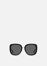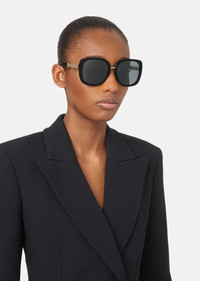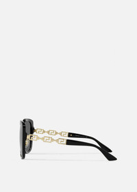 Easily recognizable by gleaming gold-toned Greca details at the temples, these bold sunglasses channel signature Versace glamour. The statement pair feature a black frame and dark grey lenses. DETAILS & CARE - Soft rectangular shape - Frame color: Black - Temple color: Gold - Details: Gold-tone Greca hardware on the wide temples - Lens color: Dark Grey - Frame: 100% Acetate - Temples: Metal - Made in Italy SIZE & FIT - Size: 56 - Bridge: 19 - Temple: 140 - Lens base: 4