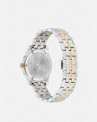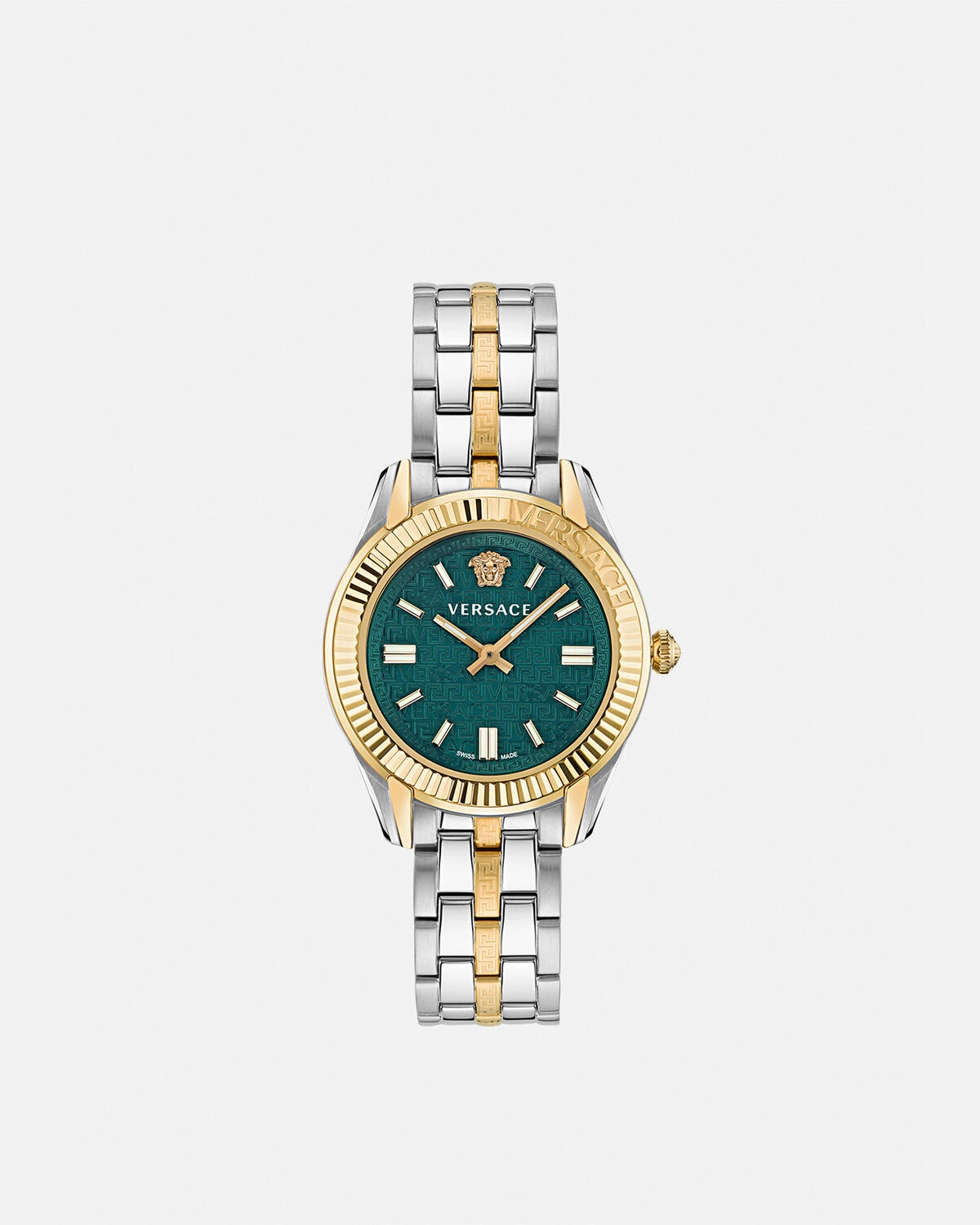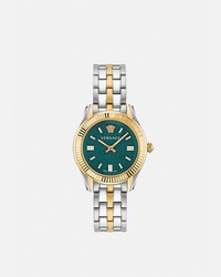 The modern timepiece is characterised by an engraved ring with Versace lettering. The dial features a tonal Greca pattern, a contrasting logo and a three-dimensional Medusa emblem. The metal band features Greca-engraved central links and is finished with a butterfly buckle closure and pushers. DETAILS & CARE - Case: IP Champagne and stainless steel case with Versace lettering on the top ring - Dial: Green dial with Versace lettering and Greca motif - Bracelet: IP Champagne and stainless steel band with butterfly buckle - Movement: RONDA 762.3 Swiss quartz 2-hands movement - Water Resistant: 5 ATM SIZE & FIT - Case size: 1'4" in