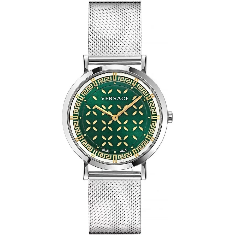 Silver-tone stainless steel case with a silver-tone stainless steel mesh bracelet. Fixed silver-tone stainless steel bezel. Green dial with gold-tone hands and index hour markers. Dial Type: Analog. Quartz movement. Scratch resistant sapphire crystal. Pull / push crown. Solid case back. Round case shape, case size: 36 mm, case thickness: 7 mm. Band width: 17 mm. Fold over clasp. Water resistant at 50 meters / 165 feet. Functions: hour, minute. New Generation Series. Casual watch style. Watch label: Swiss Made. Versace New Generation Quartz Green Dial Ladies Watch VE3M01123. CASE Case Size: 36 Case Thickness: 7 mm Case Material: Stainless Steel Case Shape: Round Case Back: Solid BAND Band Material: Stainless Steel Mesh Band Type: Bracelet Band Color: Silver-tone Band Width: 17 mm Clasp: Fold Over DIAL Dial Color: Green Type: Analog Crystal: Scratch Resistant Sapphire Hands: Gold-tone Dial Markers: Index Bezel: Fixed Bezel Color: Silver-tone Bezel Material: Stainless Steel Crown: Pull / Push INFORMATION Brand: Versace Series: New Generation Collection Name: New Generation Gender: Womens Model: VE3M01123 Watch Label: Swiss Made Movement: Quartz FEATURES Water Resistance: 50 meters / 165 feet Functions: Hour, Minute Watch Features: Stainless Steel, Gold, Analog ADDITIONAL INFO Watch Style: Casual Warranty: 2 Year Jomashop Warranty Jomashop Sku: VER-VE3M01123 Department: Watches