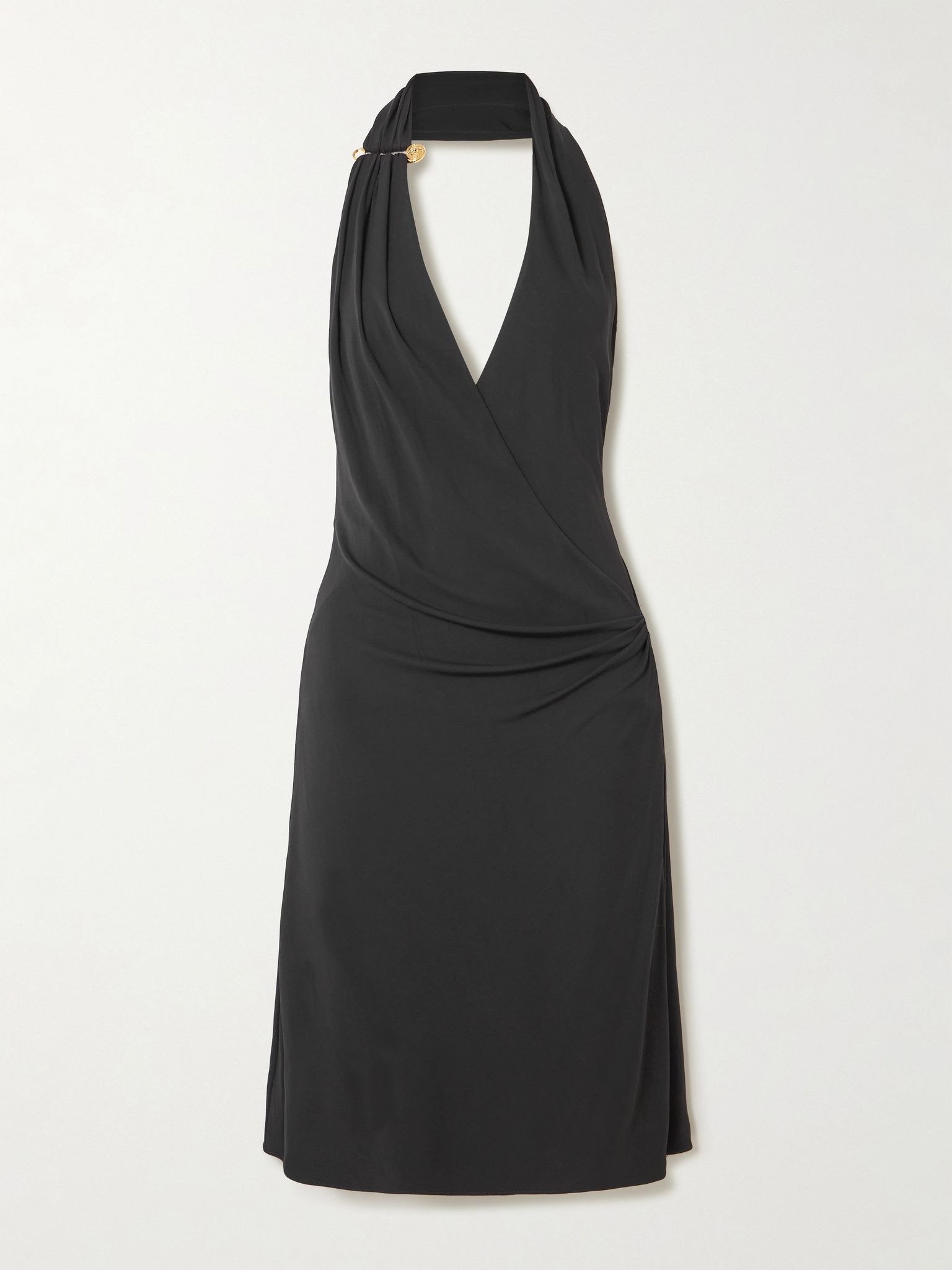 There's something so captivating about Versace's little black dress. It's draped in an elegant halterneck profile from smooth stretch-jersey and embellished with a Medusa pin on one side of the halterneck. Take cues from the brand's '90s styling and team yours with strappy heels and layers of jewelry. Size & Fit - Fits true to size, take your normal size - Intended to be fitted at the bust and waist, slightly loose at the hip - Mid-weight, stretchy fabric - Model is 175cm/ 5'9" and is wearing an IT 38 Model measurements: - Bust: 81cm/ 32" - Waist: 62cm/ 24.5" - Hip: 89cm/ 35" Details & Care - Black stretch-jersey - Concealed hook and zip fastening at side - 95% viscose, 5% elastane - Dry clean