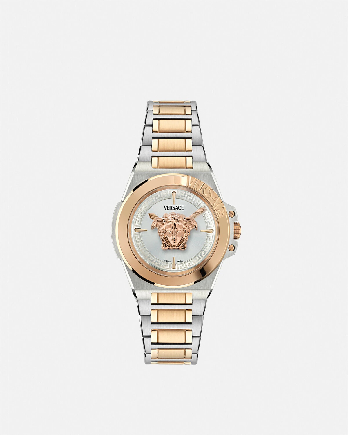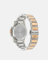 DETAILS A classic, iconic watch celebrating the beauty and charm of the Medusa floating on the Soleil dial, enriched with the Versace logo at the top ring. All Versace watches are guaranteed by the 'Swiss Made' marking. - Case: Bicolor (SS&IP2N) case with Versace logo on top ring - Dial: Soleil Silver dial with 3D Medusa between two glasses / Versace logo at 12h - Bracelet: Bicolor (SS&IP2N) bracelet with butterfly buckle - Movement: RONDA 762 Swiss Quartz 2-hands movement - Water Resistant: 5 ATM Item: PVE8D004-P0024_RTU_TU_PNUL__ SIZE & FIT - Case: 1.5"