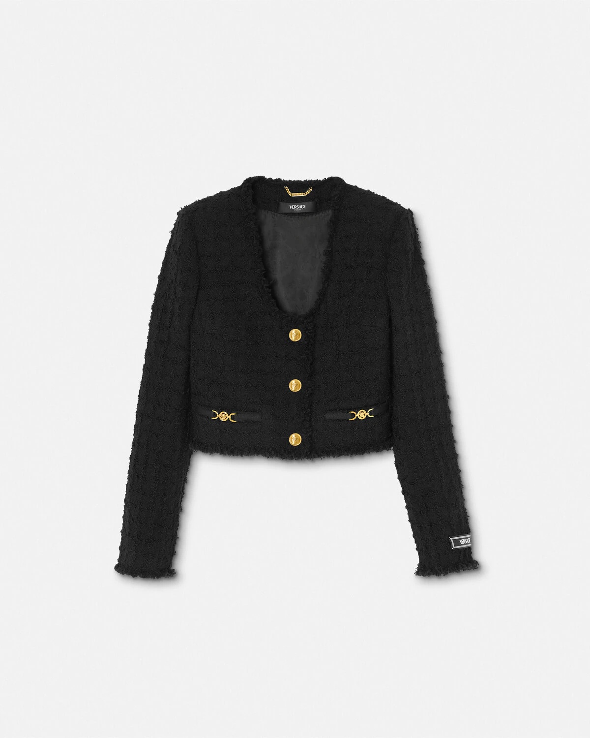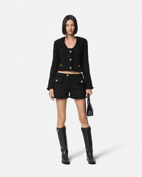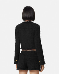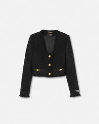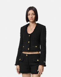 DETAILS A wool and mohair blend heritage bouclé tweed cardigan jacket with a low-cut neckline, single-breasted closure, and accent Medusa '95 hardware. A jacquard Versace tailoring label details the sleeve. - Medusa '95 hardware - Tailoring label - Long sleeves - Collarless - Front button closure - Buttoned cuffs - Outer composition: 77% Pure virgin wool, 14% Mohair, 9% Nylon - Lining: 58% Cupro, 42% Viscose - Trim: 74% Acetate, 26% Viscose Item: 1015744-1A10096_1B000 SIZE & FIT - The model is 5'10" tall and wears size 38 IT