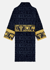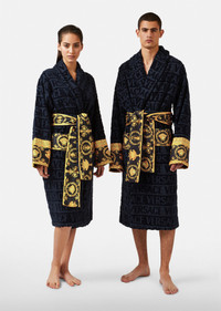 Covered in a faint textural Versace logo print and accented by a Barocco printed sleeve and wrap belt, this soft and iconically covered bathrobe exudes luxury. DETAILS & CARE - Towelling bathrobe - Detachable belt with Barocco print - Pockets on the front - Greca print details on the sleeves - 100% Cotton - Cool iron - Do not bleach - Do not dry clean - Machine wash at 30° C - Wash with a Chlorine free detergent - Tumble dry low SIZE & FIT - All sizes fit Italian standards