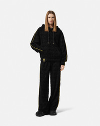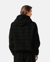DETAILS This terrytowelling hooded sweatshirt features a tonal Versace Allover pattern and is accented by I Baroque piping trims along the sleeves - Versace Allover motif - I Baroque print - Drawstring hood - Elastic waistband - Kangaroo pocket - Outer composition: 100% Cotton - Lining: 100% Cotton - Trim: 100% Cotton Item: 1020183-1A14584_Z7011 SIZE & FIT - The female model is 5'10" / 1.79 m tall and wears size XS. The male model is 6'3" / 1.91 m tall and wears size M.