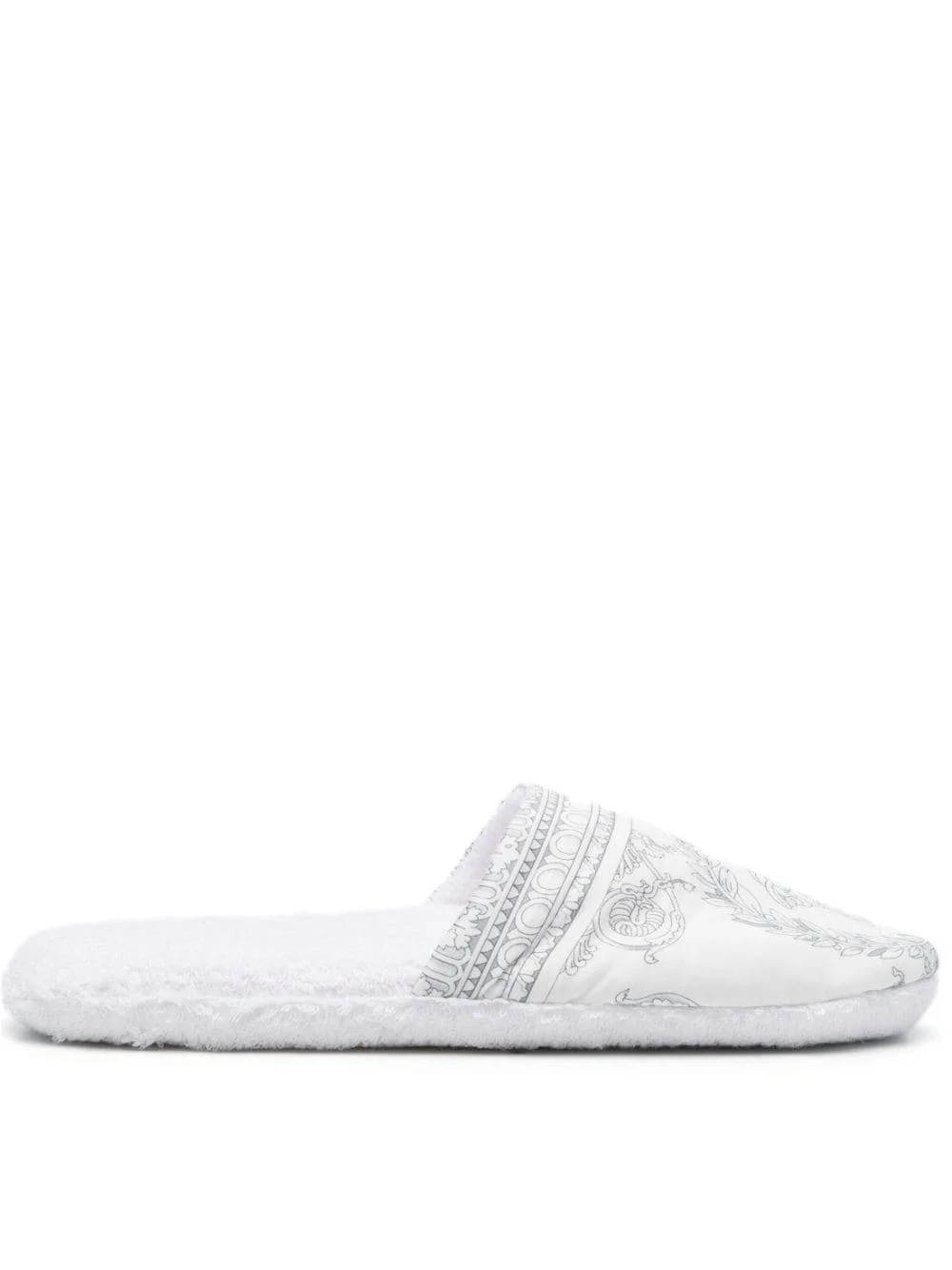 I Love Baroque slippers Versace's slippers align with the brand's ornate aesthetic. This white cotton iteration is decorated with the brand's signature Barocco motif. Highlights - White/grey - Cotton - Signature barocco print - Round toe - Slip-on style Made in Italy Composition Sole: Fabric 100% Lining: Polyurethane 100%, Fabric 100% Outer: Cotton 100%