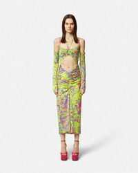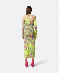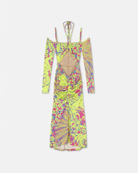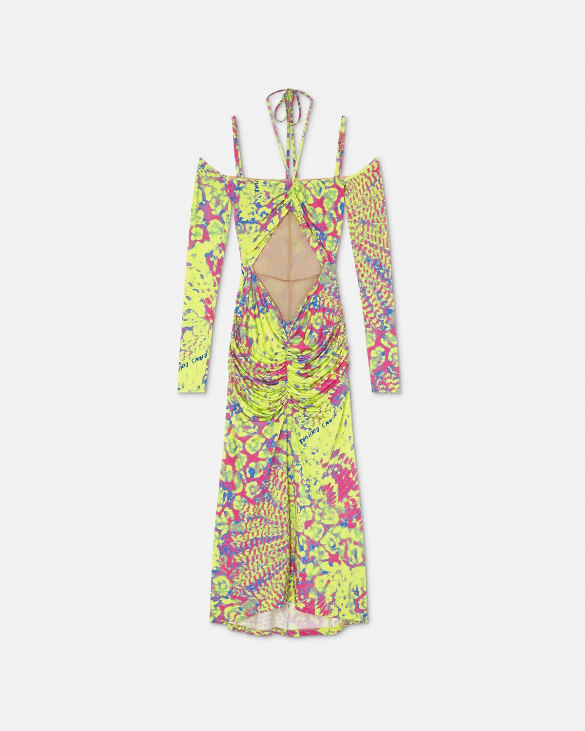 DETAILS This cutout jersey midi dress features an acid-toned Animalier print with off-the-shoulder long sleeves and a self-tie string halterneck with accent Institutional logo hardware on one shoulder strap. - Animalier print - Institutional logo hardware - Long sleeves - Shoulder straps - Concealed side zip closure - Outer composition: 90% Viscose, 10% Elastane - Lining: 100% Nylon Item: E76HAO901-EJS282_E609 SIZE & FIT - The model is 5'10" tall and wears size 40 - All sizes fit Italian standards