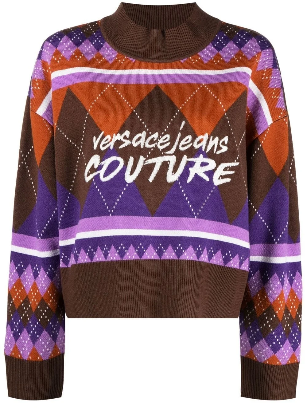 argyle-knit logo-embroidered jumper Designed with a multicolour argyle knit construction; this wool-blend jumper forms part of the Versace Jeans Couture AW22 collection. Built with a mock neck and classic ribbed trims, the eye-catching silhouette is finished with an embroidered logo at the chest. Imported Composition Acrylic 70%, Wool 30% SIZE & FIT Model measurements Height 5 ft 10 in(1.79 m) Bust/Chest 31.1 in(79 cm) Hips 35.03 in(89 cm) Waist 24.01 in(61 cm) Washing instructions Hand Wash