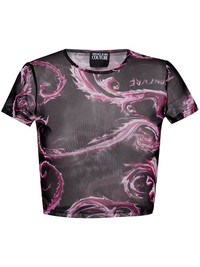 Barocco-print crop top Highlights - Black/multicolour - Stretch-design - Tulle netting - Sheer coverage - All-over graphic print - Signature barocco print - Crew neck - Short sleeves - Straight hem - Cropped Imported Composition Polyester 92%, Elastane 8%