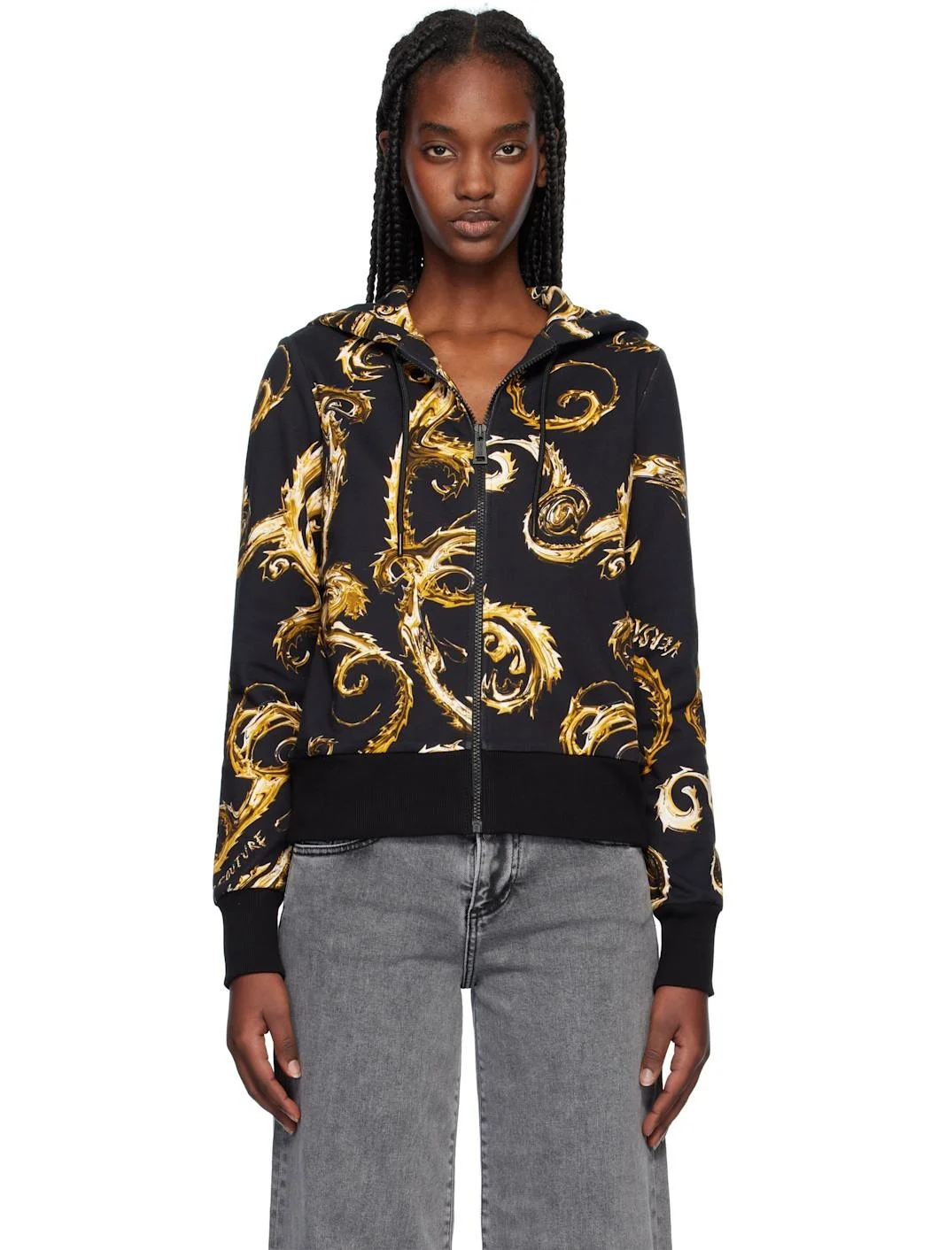 French terry hoodie. Logo graphic pattern printed throughout. · Drawstring at hood · Zip closure · Zip seam pockets · Rib-knit hem and cuffs Supplier color: Black/Gold Body: 100% cotton. Trim: 95% cotton, 5% elastane. Made in Albania 242202F097002