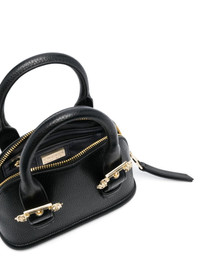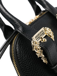 Baroque-buckle faux-leather tote bag Crafted from faux-leather with a durable grained finish, this compact tote bag by Versace Jeans Couture is elevated by its ornate gold-tone buckles at the top straps – note the logo detail and signature 3D filigree borders. Highlights - Black - Faux leather - Two rolled top handles - Adjustable detachable shoulder strap - Logo-engraved buckle - All-around zip fastening - Internal zip-fastening pocket - Internal logo plaque - Main compartment - Metal feet - Gold-tone hardware Imported Composition Outer: Polyester 100%, Polyurethane Resin 100% Lining: Polyester 100% SIZE & FIT Measurement DEPTH 3.54 in(9 cm) HANDLE 3.14 in(8 cm) HEIGHT 5.9 in(15 cm) STRAP 23.62 in(60 cm) WIDTH 7.87 in(20 cm)