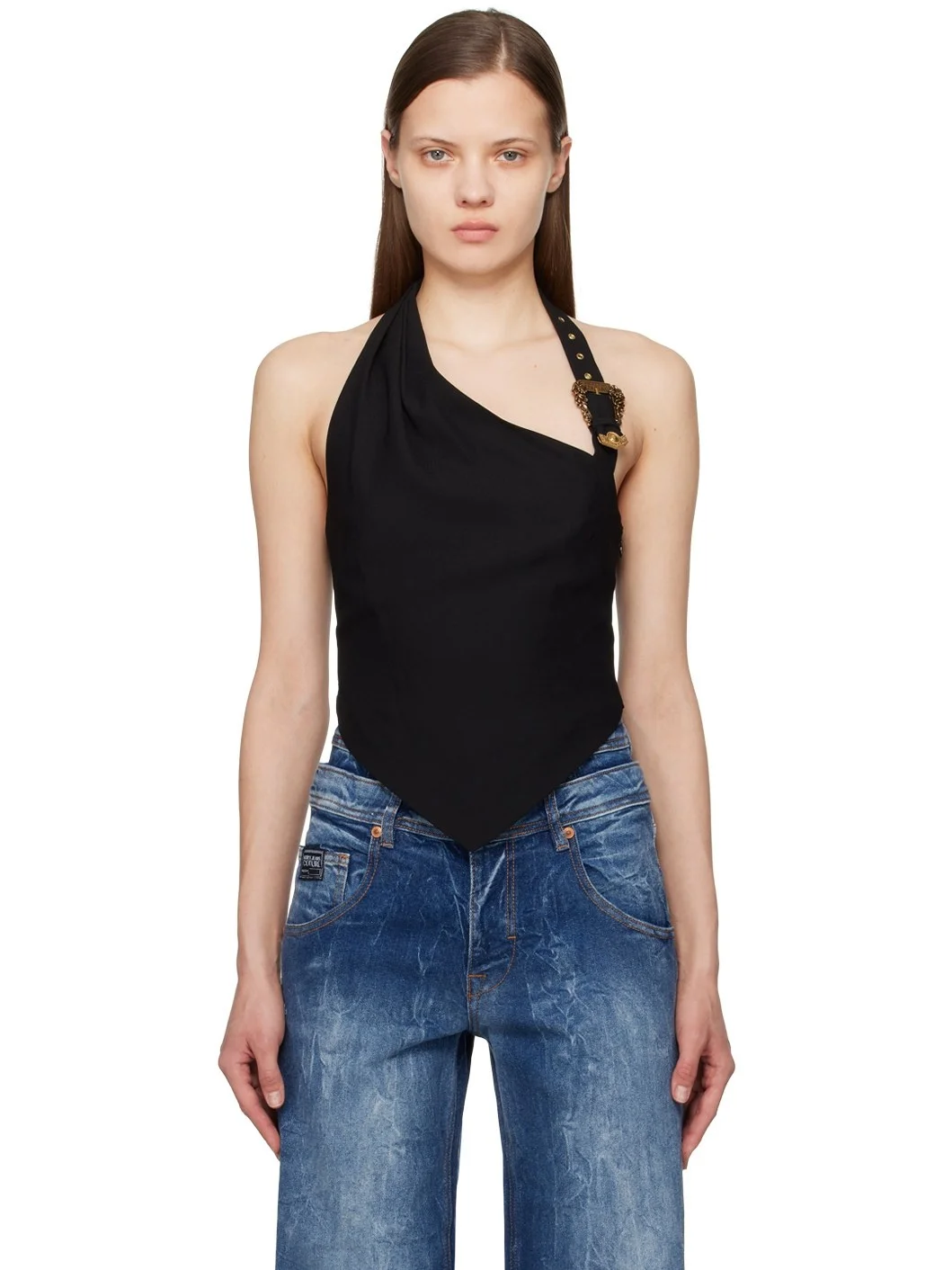 Polyester crepe tank top. · Asymmetrical construction · Cropped hem · Zip closure at side seam · Logo hardware at pin-buckle halter strap · Gathering at shoulder · Open back · Full sateen lining Supplier color: Black Body: 100% polyester. Lining: 52% acetate, 48% polyester. Made in Italy 241202F111018