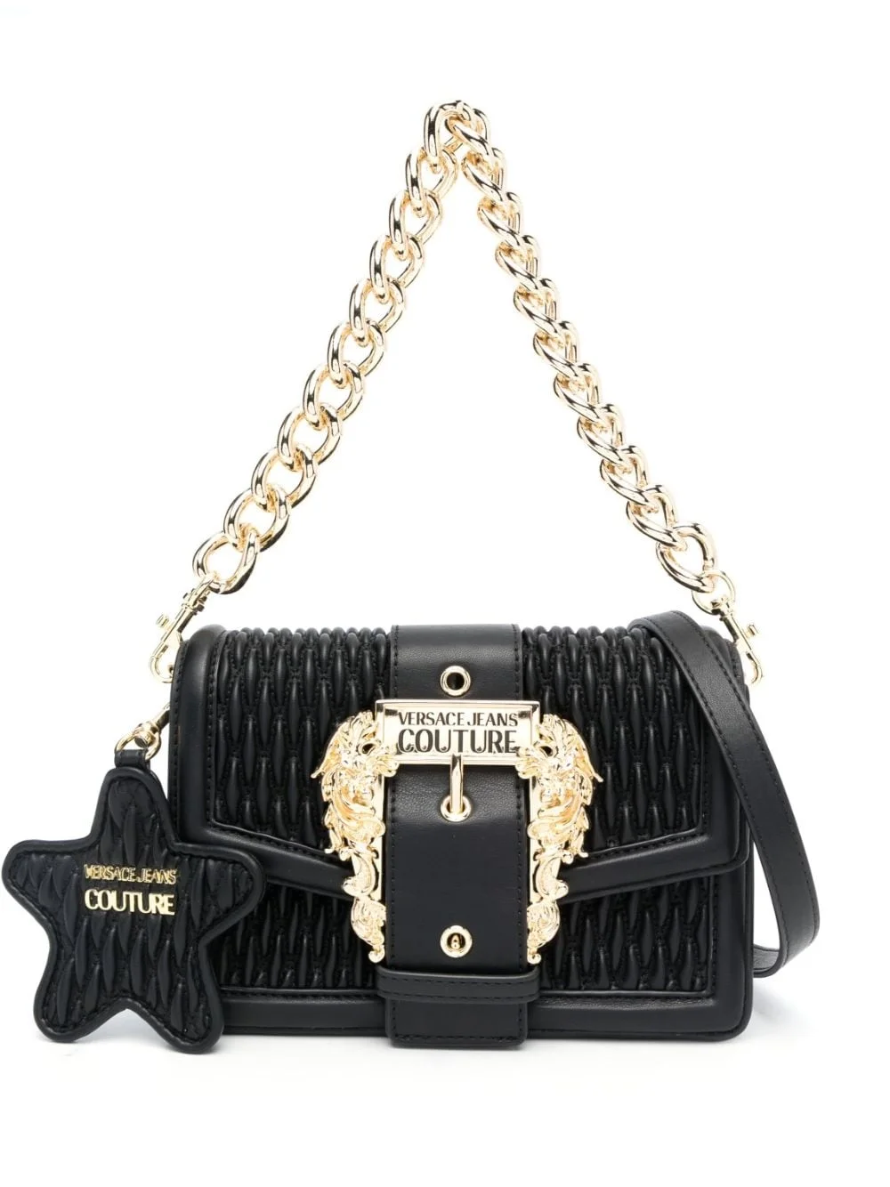 Baroque-buckle quilted shoulder bag Capturing Versace Jeans Couture's opulent aesthetic, this shoulder bag boasts a distinctive quilted construction accented with the signature Baroque buckle in gold-tone hardware. Made from black artificial leather, it comes in a small size and features a detachable chain-link handle. Highlights - Black - Faux leather - Quilted - Gold-tone hardware - Decorative buckle detail - Foldover top with magnetic fastening - Main compartment - Internal logo plaque - Single chain-link top handle - Adjustable detachable shoulder strap - Charm detail Imported Composition Outer: Polyurethane 100% SIZE & FIT Model measurements Height 5 ft 11 in(1.8 m) Bust/Chest 34.25 in(87 cm) Hips 35.82 in(91 cm) Waist 24.8 in(63 cm) Measurement DEPTH 2.75 in(7 cm) HANDLE 7.08 in(18 cm) HEIGHT 5.9 in(15 cm) STRAP 20.47 in(52 cm) WIDTH 8.26 in(21 cm)