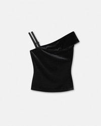This asymmetric ribbed top in velvet features a draped one-shoulder design and Baroque buckle accents on the shoulder strap. - Baroque buckle hardware - Sleeveless - Adjustable shoulder straps - Outer composition 1: 89% Polyester, 11% Elastane - Outer composition 2: 99% Cotton, 1% Elastane - Lining: 68% Acetate, 32% Polyester Item: E79HAM616-EJ0237_E48_40_E899__