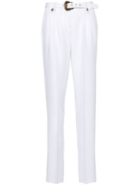 Baroque Buckle tapered trousers Highlights - Optical white - Crepe texture - Tapered leg - Belted waist with baroque buckle - Pleat detailing - Two diagonal pockets to the sides - Pressed crease - Front buckle, button and zip fastening Made in Italy Composition Lining: Polyester 100% Outer: Polyester 93%, Elastane 7% SIZE & FIT Model measurements Height 5 ft 9 in(1.76 m) Bust/Chest 31.88 in(81 cm) Hips 35.43 in(90 cm) Waist 22.44 in(57 cm) FittingInformation Designed for a straight-leg fit, these trousers allow for a close fit at the waist and an unrestricted, comfortable fit over the leg Made from a midweight stretch fabric, this piece offers elasticity and flexibility when worn This piece fits true to size – take your usual size