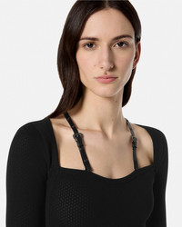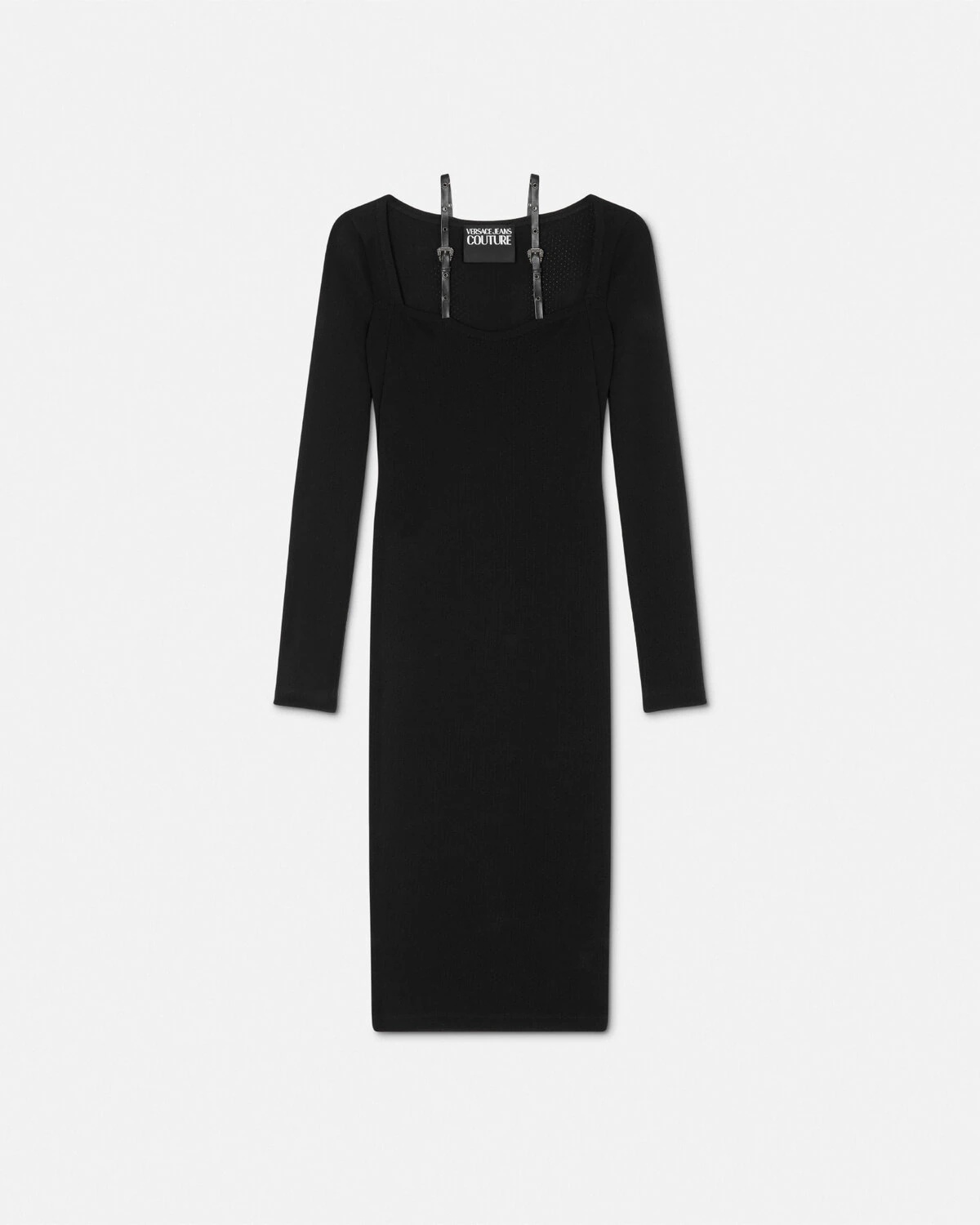 DETAILS This openwork rib knit midi dress features thin coated shoulder straps with Baroque buckle accents - Baroque buckles - Slip-on - Long sleeves - Straight neckline - Adjustable shoulder straps Outer composition: 100% Nylon Item: E77HAO979-EJ0150_E899 SIZE & FIT - The model is 5'10" / 1.81 m tall and wears size 40 IT