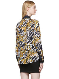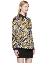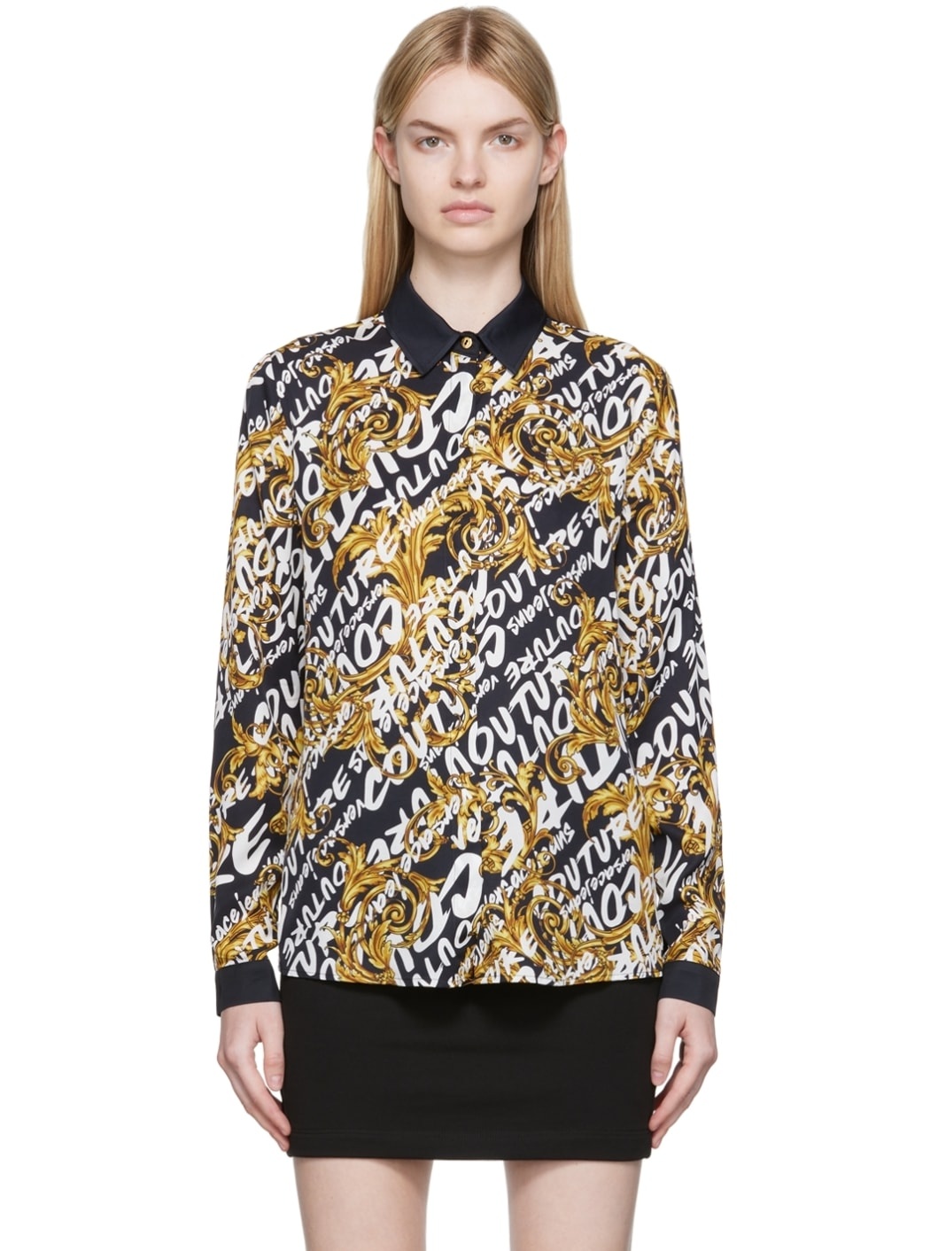 Viscose twill shirt. Logo graphic pattern printed throughout. · Spread collar · Concealed button closure · Single-button barrel cuffs · Shirttail hem Supplier color: Black/Gold 100% viscose.