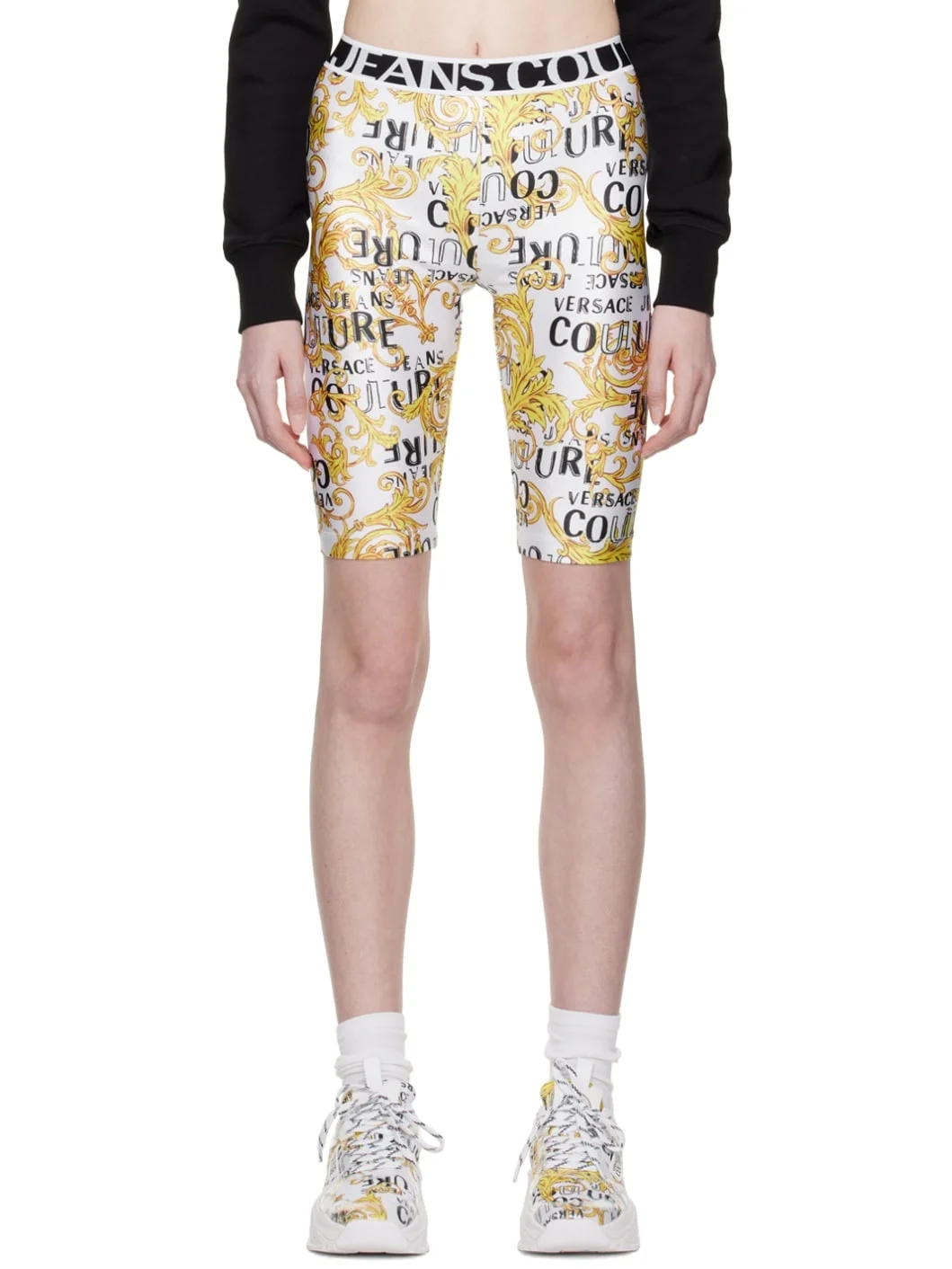 Stretch polyester jersey shorts. · Logo graphic printed throughout · Jacquard logo at elasticized waistband Supplier color: White/Gold 80% polyester, 20% elastane. Made in Albania 231202F088012