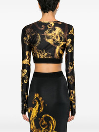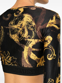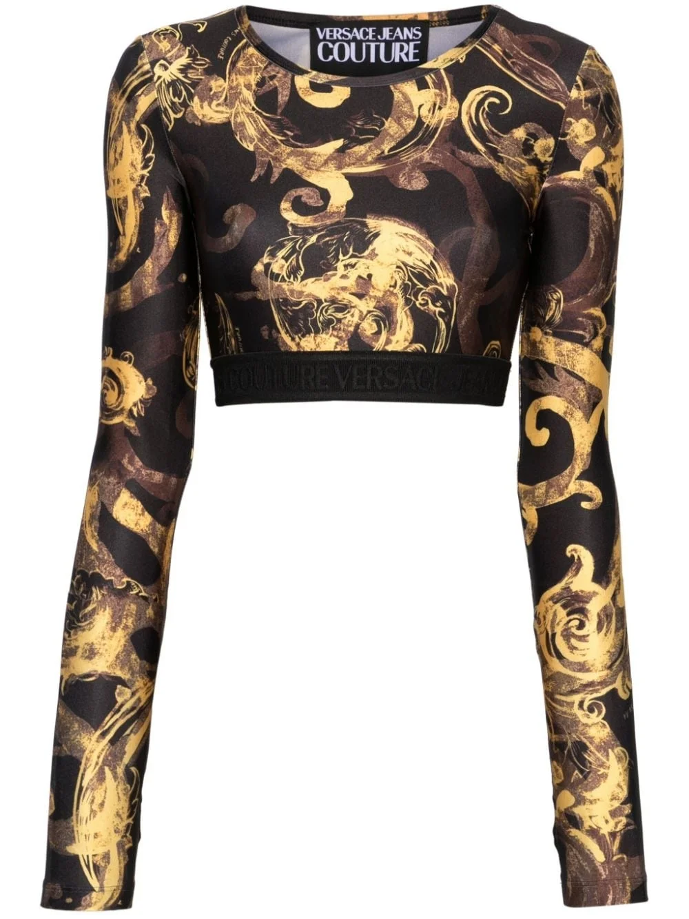 Watercolour Couture crop top Highlights - Black/gold-tone - Stretch-jersey - Baroque-pattern print - Logo underband - Round neck - Long sleeves - Fitted-cuff sleeves - Elasticated underband - Cropped - Authenticity qr code Imported Composition Polyester 80%, Elastane 20% SIZE & FIT Model measurements Height 5 ft 9 in(1.76 m) Bust/Chest 31.88 in(81 cm) Hips 35.43 in(90 cm) Waist 24.8 in(63 cm) FittingInformation Designed for a close fit throughout The sleeves are constructed with additional length and built-in thumb loops that allow for movement and a secure fit Made from a midweight stretch fabric, this piece offers elasticity and flexibility when worn This piece fits true to size – take your usual size Washing instructions Machine Wash