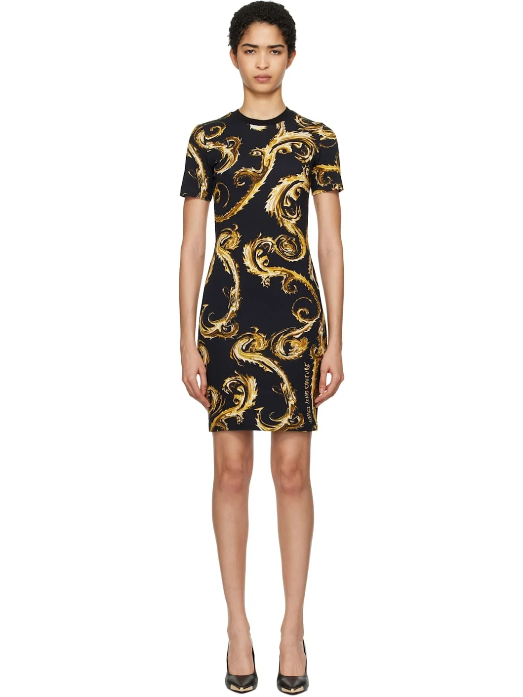 Stretch cotton jersey minidress. · Logo graphic pattern printed throughout · Rib-knit crewneck Supplier color: Black/Gold Body: 92% cotton, 8% elastane. Trim: 100% cotton. Made in Albania 242202F052029