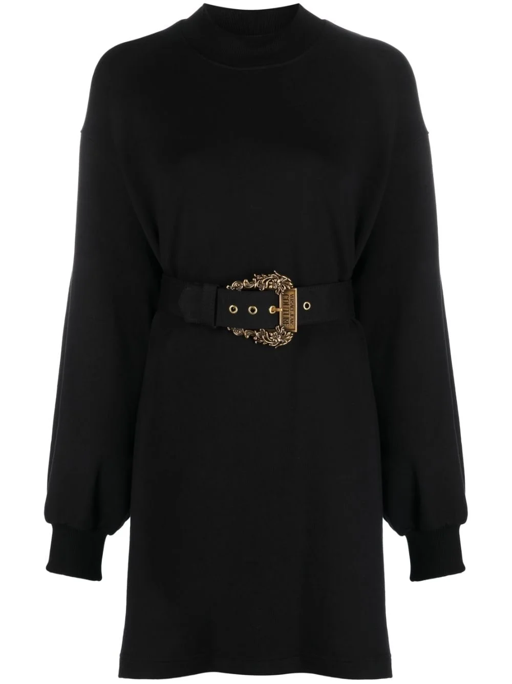 belted long-sleeve minidress Made in Italy from soft cotton, this long-sleeve minidress from Versace Jeans Couture taps into the brand's streetwear-inspired take on garments thanks to its sweatshirt silhouette. An intricately engraved gold-tone buckle cinches the waist for a more fitted shape. Highlights - Black - Cotton - High neck - Long sleeves - Belted waist - Gold-tone hardware - Thigh-length Made in Italy Composition Lining: Cotton 95%, Elastane 5% Outer: Cotton 100% SIZE & FIT Model measurements Height 5 ft 10 in(1.78 m) Bust/Chest 31.49 in(80 cm) Hips 35.03 in(89 cm) Waist 23.62 in(60 cm) FittingInformation Designed to be unstructured, offering a loose fit throughout The belt offers adjustability for fitted preferences Made from a midweight non-stretch fabric, this piece offers minimal elasticity when worn This piece fits true to size – take your usual size