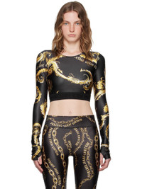 Stretch polyester jersey T-shirt. Graphic pattern and logos printed throughout. · Round neck · Logo-bonded elasticized cropped hem Supplier color: Black/Gold 80% polyester, 20% elastane. Made in Albania 242202F110011