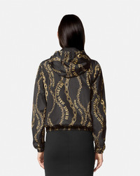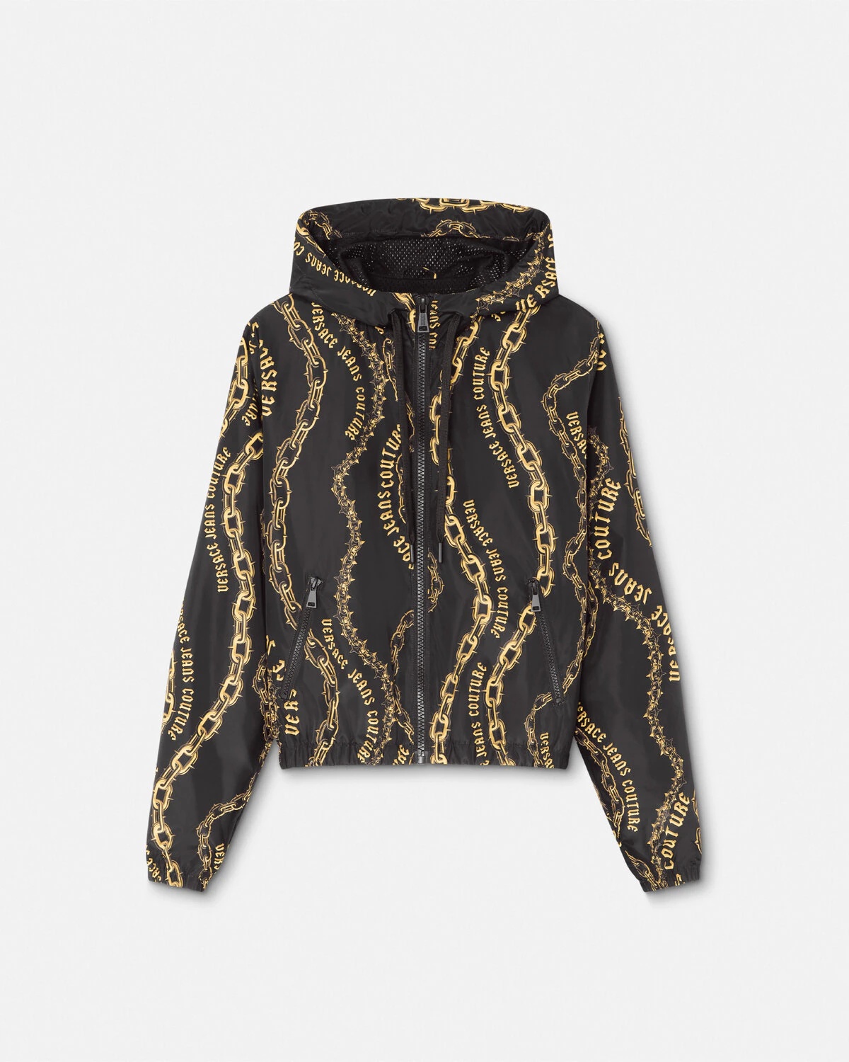 DETAILS A technical windbreaker hooded jacket with a Chain Couture print and breathable mesh lining - Chain Couture print - Long sleeves - Drawstring hood - Side zip pockets - Elastic waistband and cuffs - Outer composition: 100% Polyester - Lining: 100% Polyester Item: E77HAS401-ECQD56_EG89 SIZE & FIT - The model is 5'9" / 1.81 m tall and wears size 40 IT