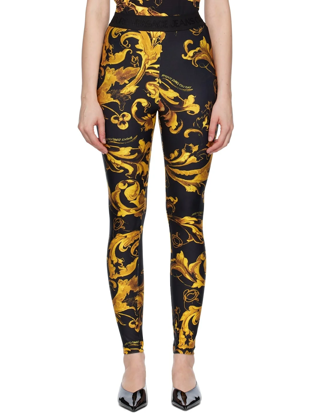 Stretch polyester jersey leggings. · Barocco pattern printed throughout · Logo-woven elasticized waistband Supplier color: Black/Gold 80% polyester, 20% elastane. Made in Albania 252202F085003