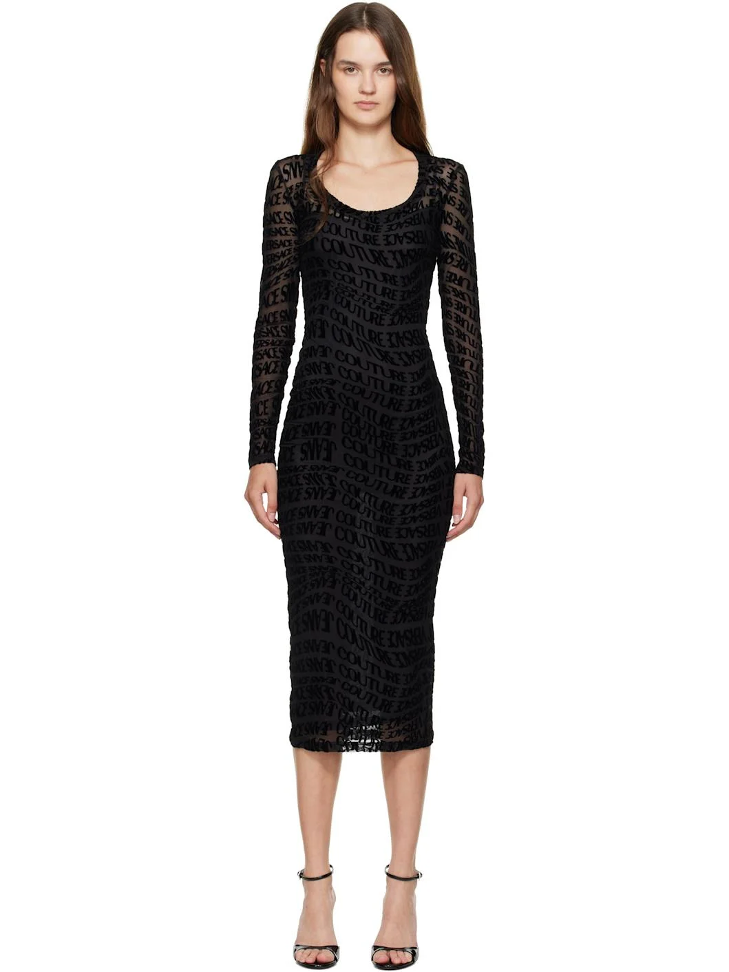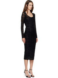 Sheer stretch mesh midi dress. · Logo pattern flocked throughout · Scoop neck · Removable mesh slip-style lining Supplier color: Black Body: 96% polyester, 4% elastane. Trim: 100% polyamide. Lining: 100% polyamide. Made in Albania 252202F054001
