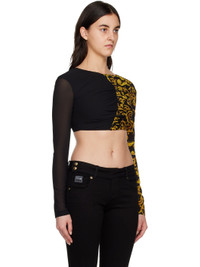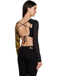 Semi-sheer polyester georgette blouse. Logo and graphic pattern printed throughout. · Crewneck · Ruching at front · Cropped hem · Zip vent at cuffs · Self-tie closure at open back Supplier color: Black/Gold 100% polyester. Made in Italy 231202F107000