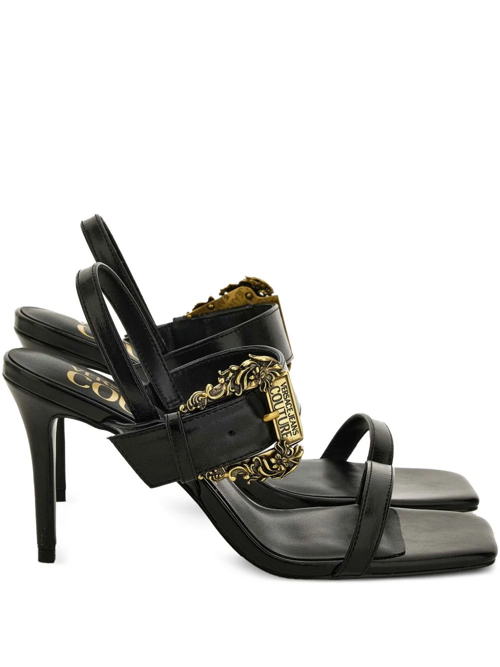 buckle-embellished heeled sandals Highlights - Black - Leather - Ornate buckle - Open toe - Square toe - Stiletto heel Imported Composition Outer: Polyurethane 100% Sole: Polyurethane 100% Lining: Fabric 100%