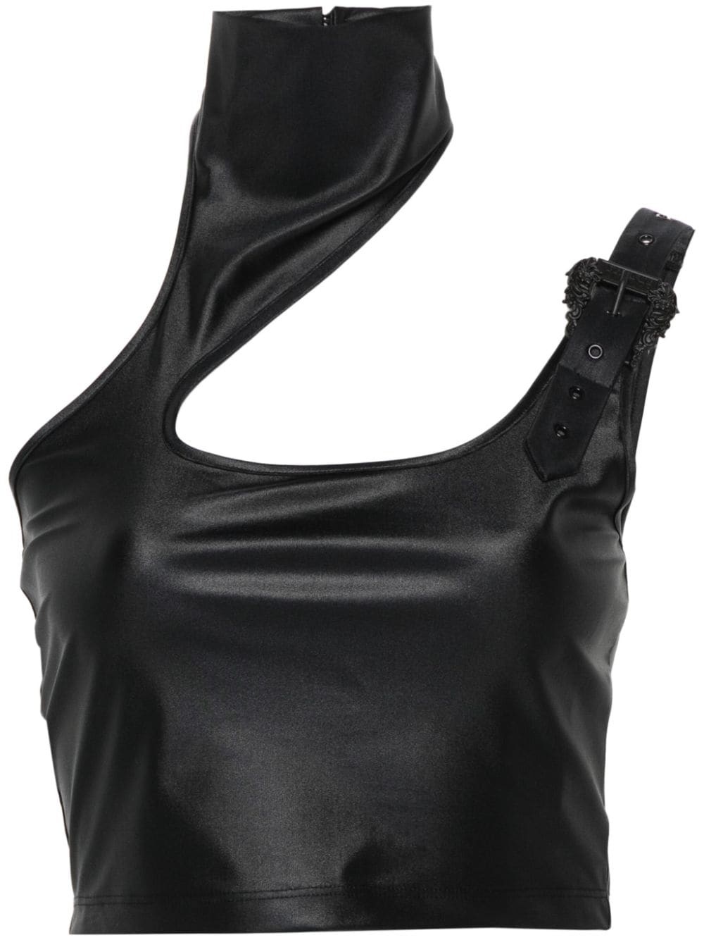 buckle-embellishment cropped top Highlights - Black - Stretch-design - Square neck - Logo-engraved buckle - Buckle-embellished shoulder straps - Single short sleeve - Button fastening at the shoulder - Straight hem - Cropped Made in Italy Composition Polyamide 79%, Elastane 21% SIZE & FIT Model measurements Height 5 ft 10 in(1.77 m) Bust/Chest 32.28 in(82 cm) Hips 34.64 in(88 cm) Waist 24.01 in(61 cm) FittingInformation Designed for a close fit throughout Cropped in length Made from a midweight stretch fabric, this piece offers elasticity and flexibility when worn This piece fits true to size – take your usual size