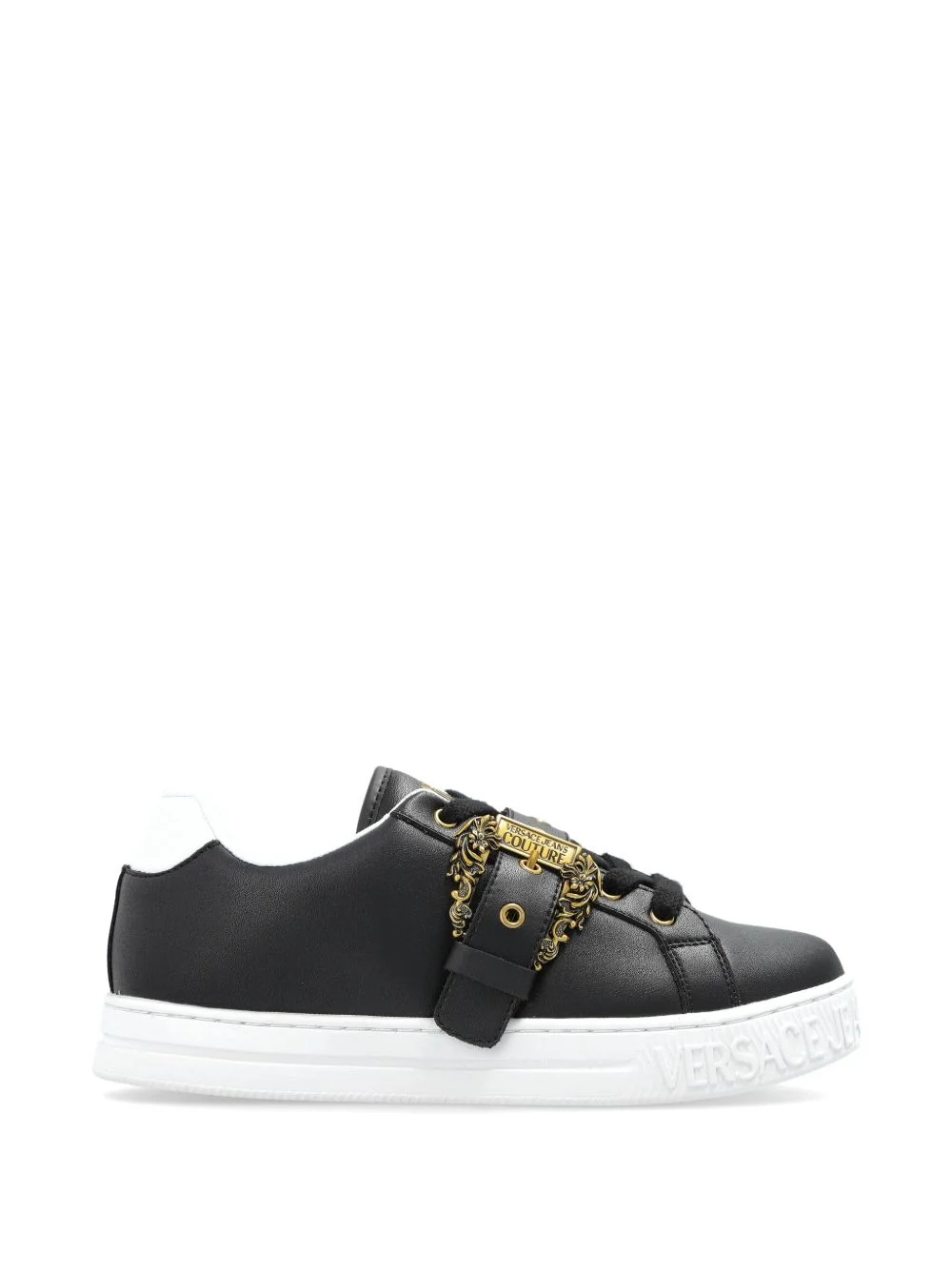 buckle leather sneakers Highlights - Black - Bovine leather - Buckle detail - Front lace-up fastening - Round toe - Rubber sole Imported Composition Outer: Camel Leather 85%, Polyurethane 15% Lining: Polyester 85%, Polyurethane 15% Sole: Rubber 100%