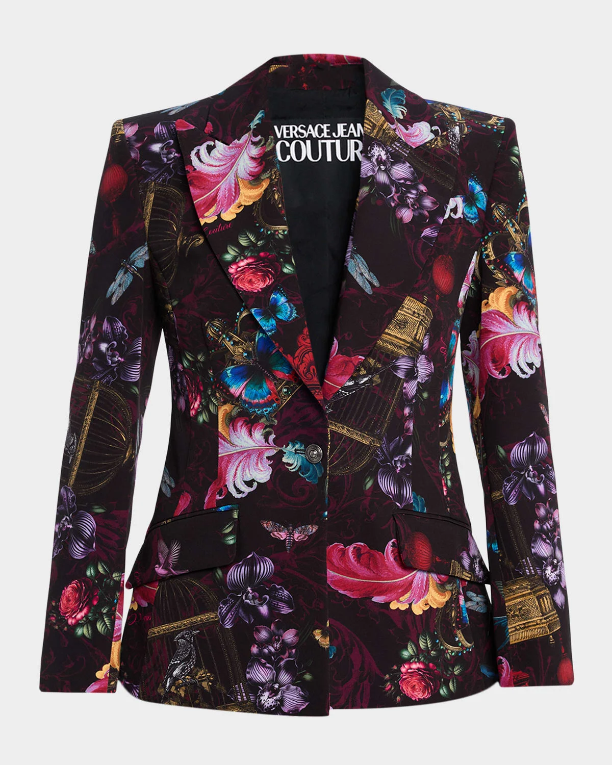 Adorned with a Cabinet De Curiosite print, this Versace Jeans Couture jacket is finished with an adjustable buckle strap at the back to cinch the waist. Peak lapels Singlebreasted front Structured shoulders Long sleeves Hip flap pockets Tailored fit Doublevented back Single buttonfront Polyester/elastane Unlined Hand wash or dry clean Imported