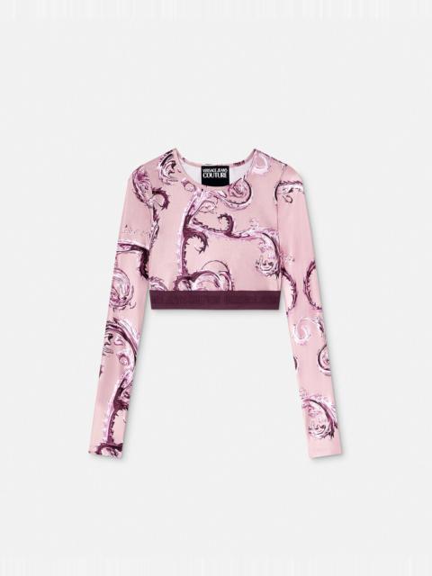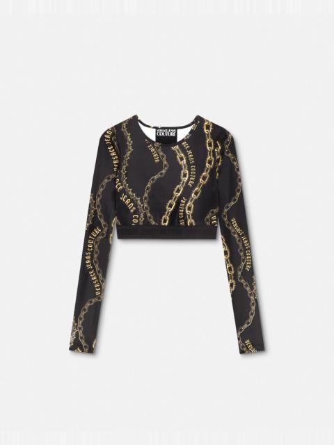 DETAILS This longsleeved cropped top features a Chain Couture print and a gothic logo motif at the jacquard elastic waistband - Chain Couture print - Long sleeves - Round neckline - Elastic waistband - Outer composition: 80% Polyester, 20% Elastane Item: E77HAH218-EJS417_EG89 SIZE & FIT - The model is 5'9" / 1.81 m tall and wears size 40 IT
