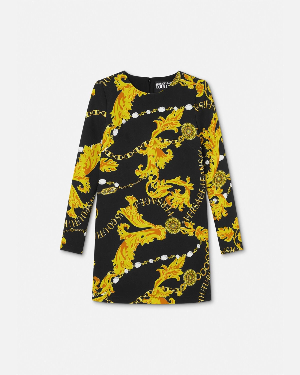 A shift mini dress featuring the Chain Couture print all-over and a long-sleeved design. DETAILS & CARE - Chain Couture print - Long sleeves - Round neckline - Concealed zip closure at the back - Lining: 100% Polyester - Outer composition: 96% Polyester, 4% Elastane - Machine wash cold - Do not bleach - Do not tumble dry - Cool iron - Dry clean SIZE & FIT - The model is 5'8" tall and wears size 40 - All sizes fit Italian standards