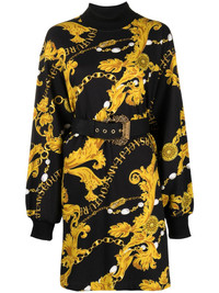 Chain Couture minidress Highlights - Black/yellow - Cotton - All-over logo print - Mock neck - Long sleeves - Belted waist - Thigh-length Imported Composition Cotton 100% SIZE & FIT Model measurements Height 5 ft 10 in(1.78 m) Bust/Chest 33.07 in(84 cm) Hips 36.61 in(93 cm) Waist 24.8 in(63 cm) FittingInformation Designed to be unstructured, offering a loose fit throughout The belt offers adjustability for fitted preferences Made from a midweight non-stretch fabric, this piece offers minimal elasticity when worn This piece fits true to size – take your usual size