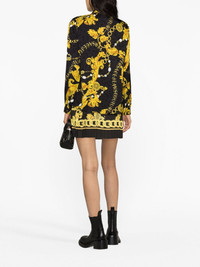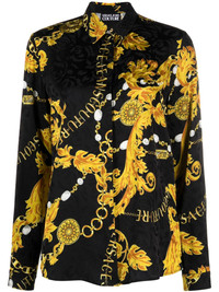 Chain Couture-print satin shirt Versace Jeans Couture's Logo Couture motif emblazes this black fluid blouse in a signature gold-tone hue — a nod to the Italian house's penchant for bold and opulent prints. Highlights - Black/gold-tone - Classic collar - Front button placket - Long sleeves - Buttoned cuffs - Straight hem Made in Italy Composition Viscose 100% SIZE & FIT Model measurements Height 5 ft 10 in(1.78 m) Bust/Chest 31.49 in(80 cm) Hips 35.03 in(89 cm) Waist 23.62 in(60 cm) FittingInformation Designed for a relaxed fit, this piece allows for comfort and movement when worn Made from a midweight non-stretch fabric This piece fits true to size – take your usual size
