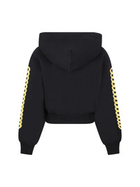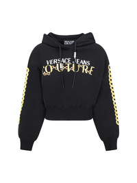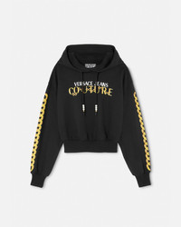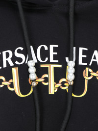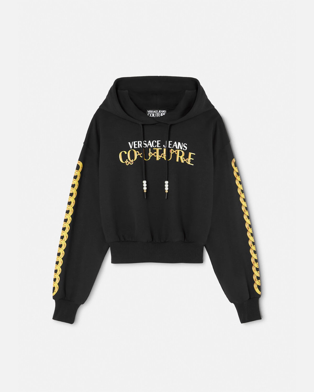 Cotton Logo Chain Hooded Sweatshirt by Versace Jeans Couture, adjustable drawstring hood, ribbed cuffs, ribbed hem, iconic brand monogram printed in contrasting color on front, monochrome design, cropped pattern, regular fit. DETAILS sku 75HAIF01CF01F_G89 composition : COTTON 100% color group : BLACK gender : WOMAN season : AW23 size chart : WOMAN STANDARD category name : SWEATSHIRTS