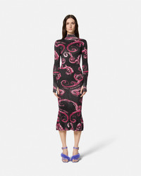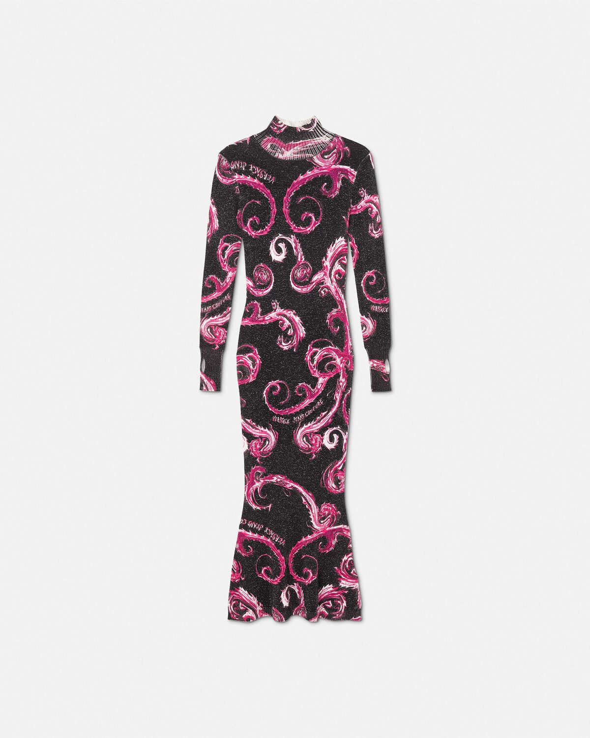 DETAILS Longsleeved knit midi dress with a lurex Chromo Couture print - Chromo Couture print - Long sleeves - Mockneck - Thumbhole cuffs - Outer composition: 90% Viscose, 10% Metallized polyester Item: E77HAOM31-ECMN80_EQY2 SIZE & FIT - The model is 5'9" / 1.81 m tall and wears size S IT