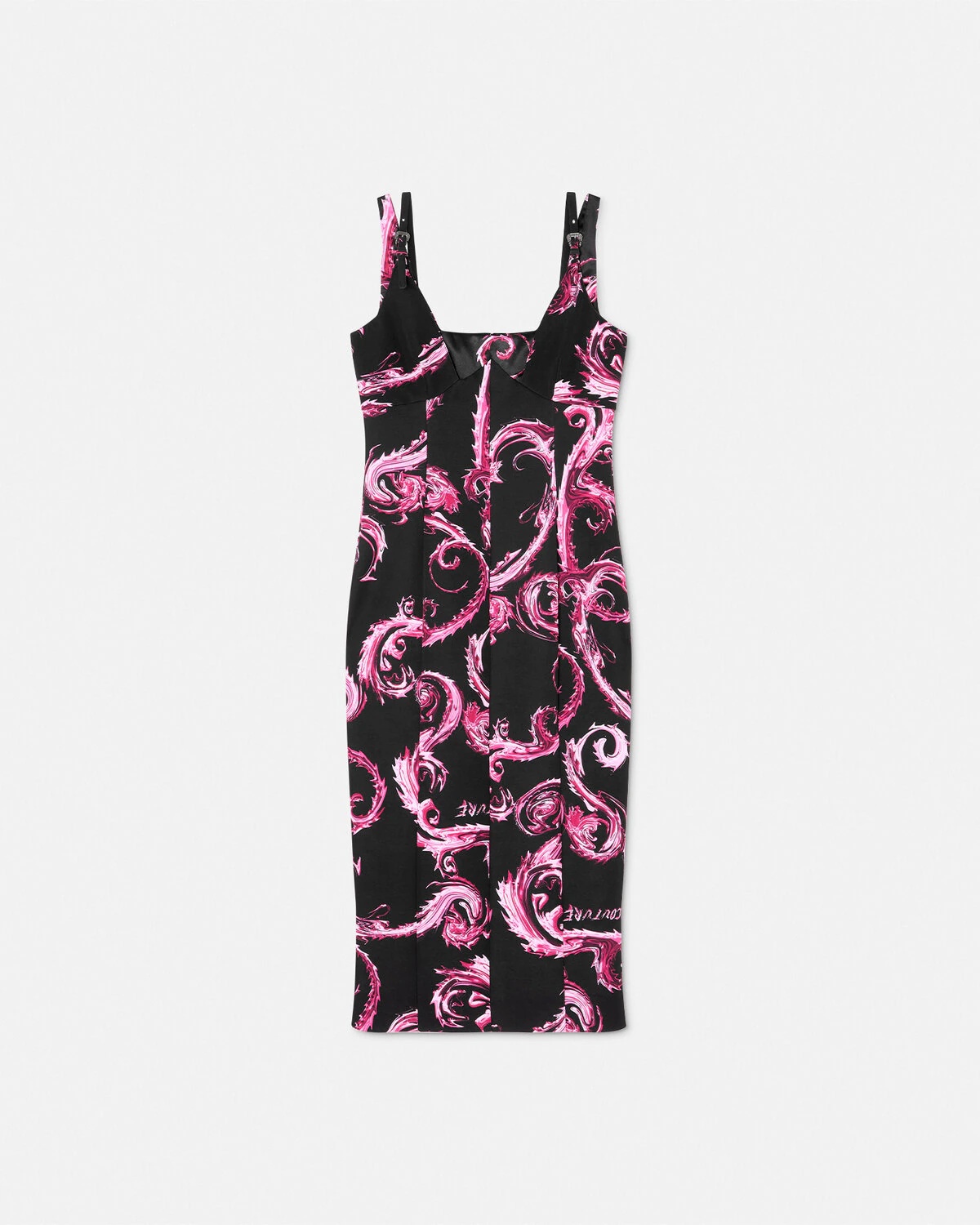 DETAILS A cady sleeveless dress with a Chromo Couture print and thin Baroque buckles on the shoulder straps. - Chromo Couture print - Baroque buckles - Sleeveless - Concealed back zip closure - Outer composition 1: 91% Polyester, 9% Elastane - Outer composition 2: 97% Polyester, 3% Elastane - Lining: 100% Polyester Item: E77HAO919-ENS515_EQY2 SIZE & FIT - The model is 5'9" / 1.81 m tall and wears size 40 IT