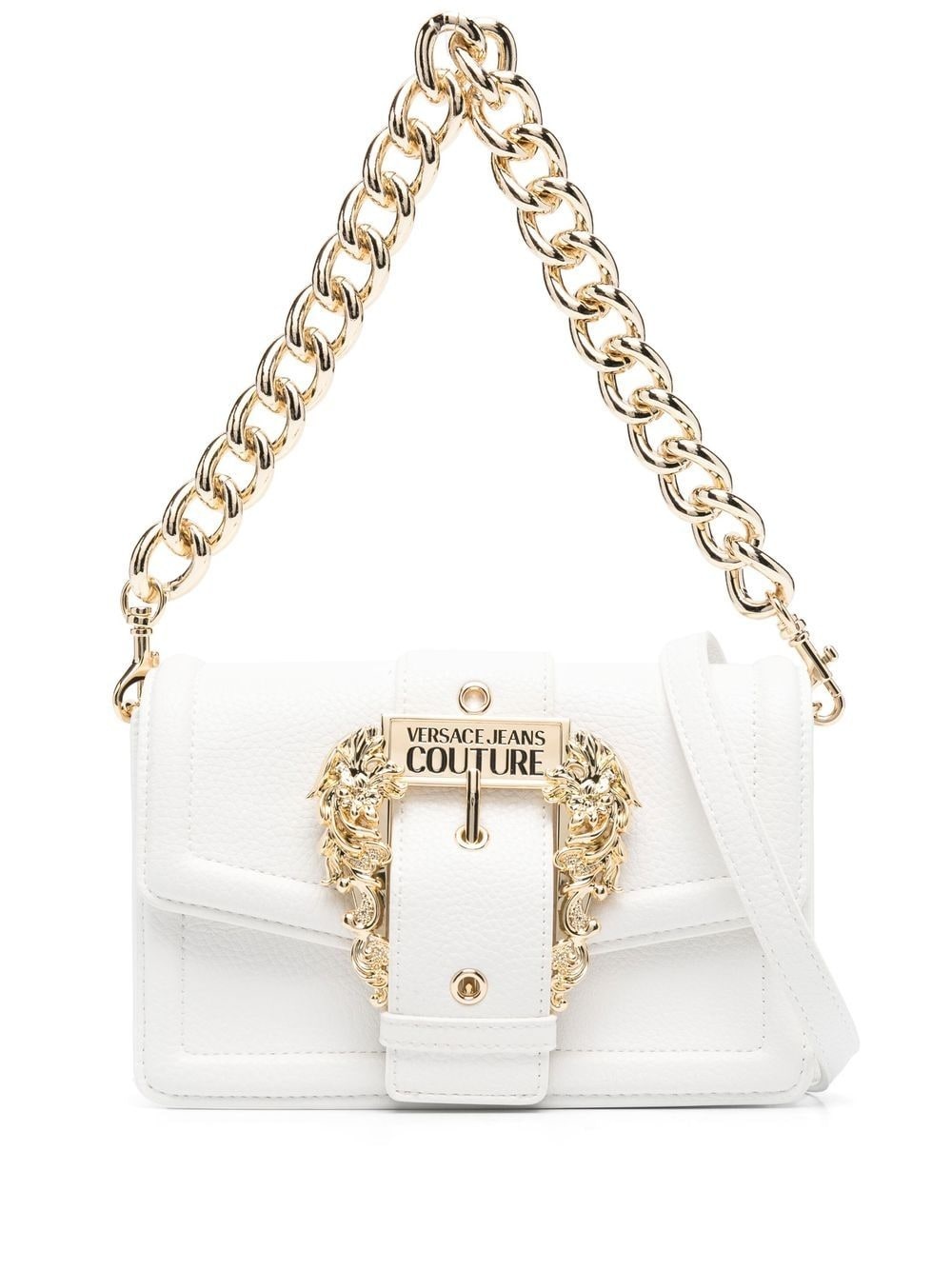 Baroque buckle shoulder bag Baroque buckle shoulder bag from VERSACE JEANS COUTURE featuring white, faux leather, grained texture, gold-tone hardware, engraved logo, logo-buckle detail, internal logo plaque, logo-print lining, detachable chain-link top handle, detachable shoulder strap, foldover top with magnetic fastening and main compartment. Imported Composition Outer: Polyurethane Resin 100%, Polyester 100% Lining: Polyester 100% SIZE & FIT Model measurements Height 5 ft 10 in(1.77 m) Bust/Chest 29.9 in(76 cm) Hips 32.7 in(83 cm) Waist 22.4 in(57 cm) Measurement DEPTH 2.4 in(6 cm) HANDLE 7.5 in(19 cm) HEIGHT 5.1 in(13 cm) STRAP 21.7 in(55 cm) WIDTH 7.9 in(20 cm)