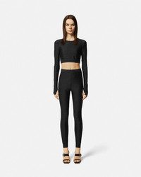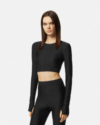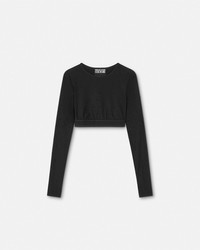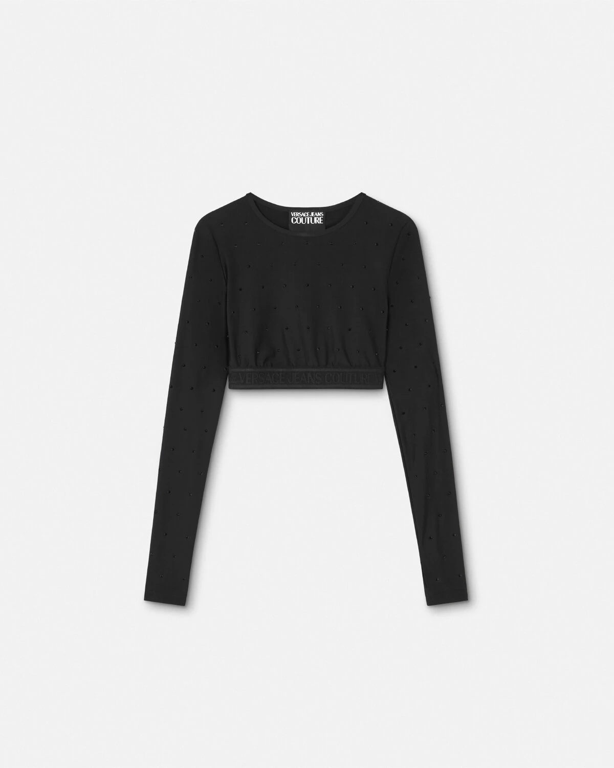 DETAILS This long-sleeved cropped top is accented by all-over crystal embellishments and is detailed by an elastic Institutional logo jacquard waistband. - Crystal embellishments - Institutional logo motif - Long sleeves - Round neckline - Elastic waistband - Outer composition: 80% Polyester, 20% Elastane Item: E76HAHE05-ECJXXE_E899 SIZE & FIT - The model is 5'11" tall and wears size S - All sizes fit Italian standards