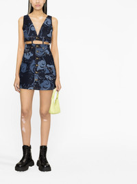 cut-out denim dress Versace Jeans Couture's bold stylings are reflected in this sleeveless dress. Made from cotton denim with an all-over swirling graphic, it features gold-tone buttons through the front and a statement cut-out at the waist. Made in Italy Composition Outer: Cotton 98%, Spandex/Elastane 2% Lining: Polyester 65%, Cotton 35% SIZE & FIT Model measurements Height 5 ft 10 in(1.77 m) Bust/Chest 32.67 in(83 cm) Hips 35.43 in(90 cm) Waist 23.62 in(60 cm) Washing instructions Machine Wash