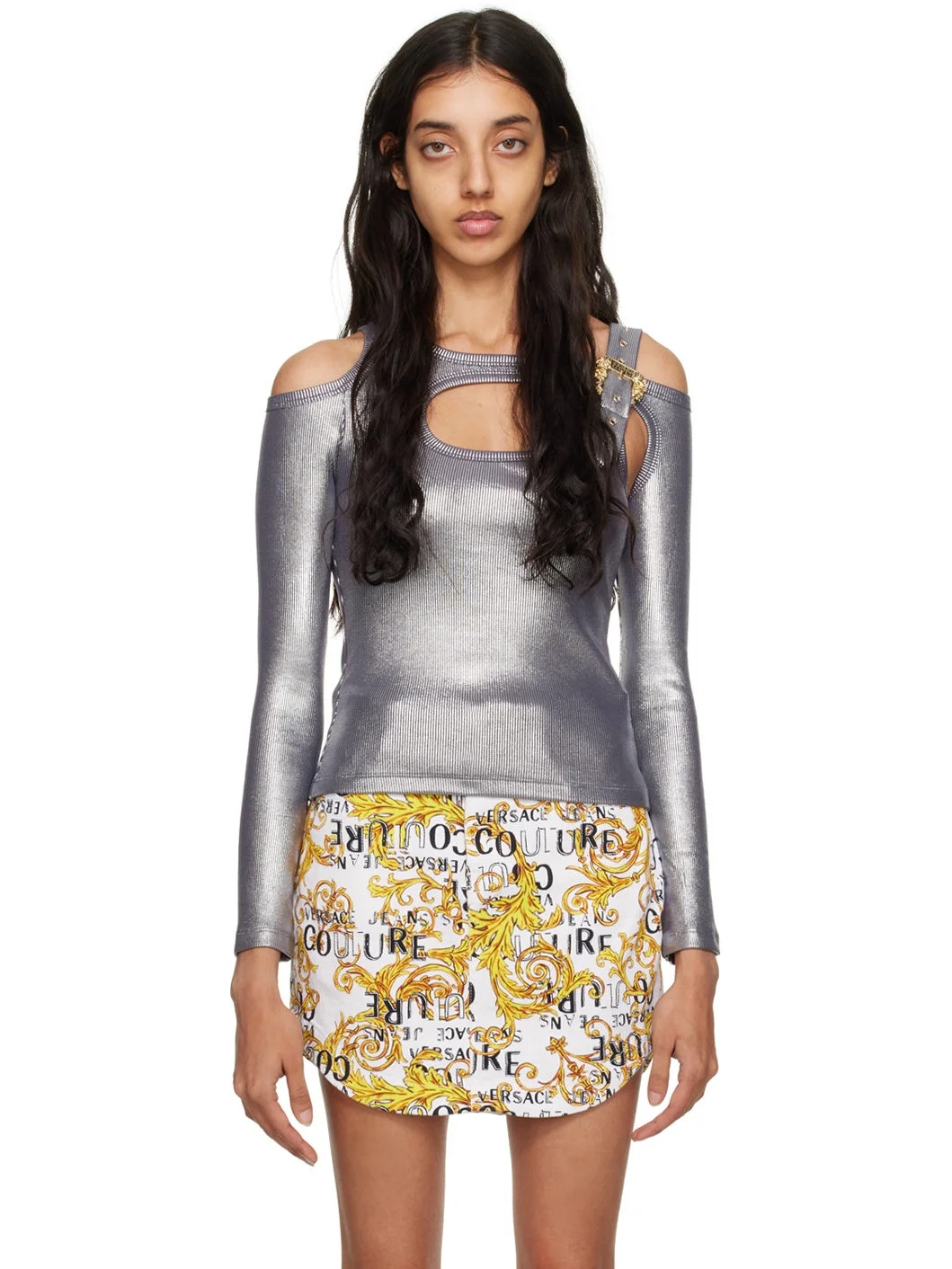 Rib knit stretch nylon T-shirt. Cut outs throughout. · Modified crewneck · Pin-buckle accent at front Supplier color: Silver 97% polyamide, 3% elastane. Made in Italy 231202F110001