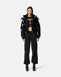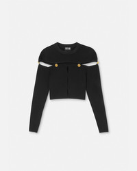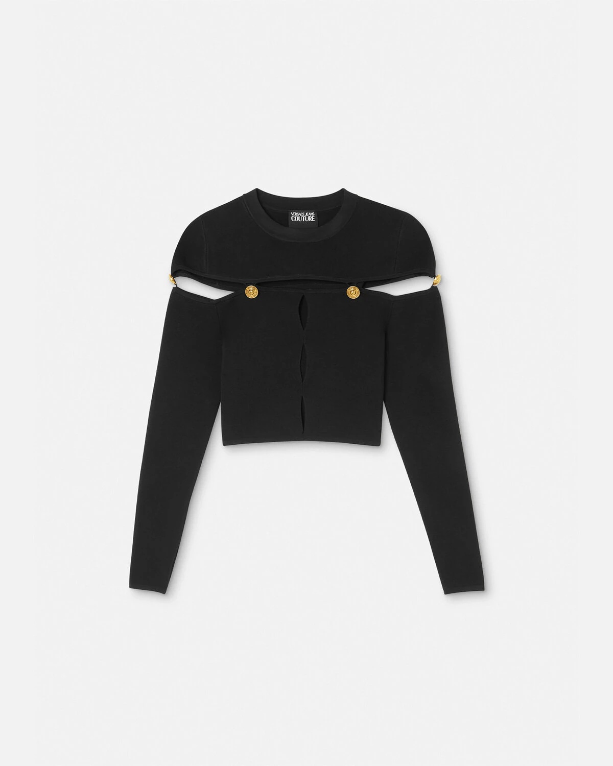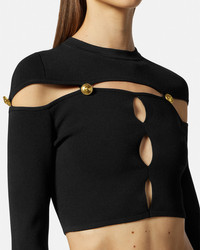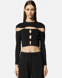DETAILS This cropped longsleeved top in a ribbed texture features a cutout design and Vemblem buttons - V-Emblem buttons - Cutout detailing - Long sleeves - Crewneck - Outer composition: 62% Viscose, 21% Polyester, 15% Nylon, 2% Elastane Item: E75HAFM51-ECM29H_E899 SIZE & FIT - The model is 5'8" tall and wears size S - All sizes fit Italian standards